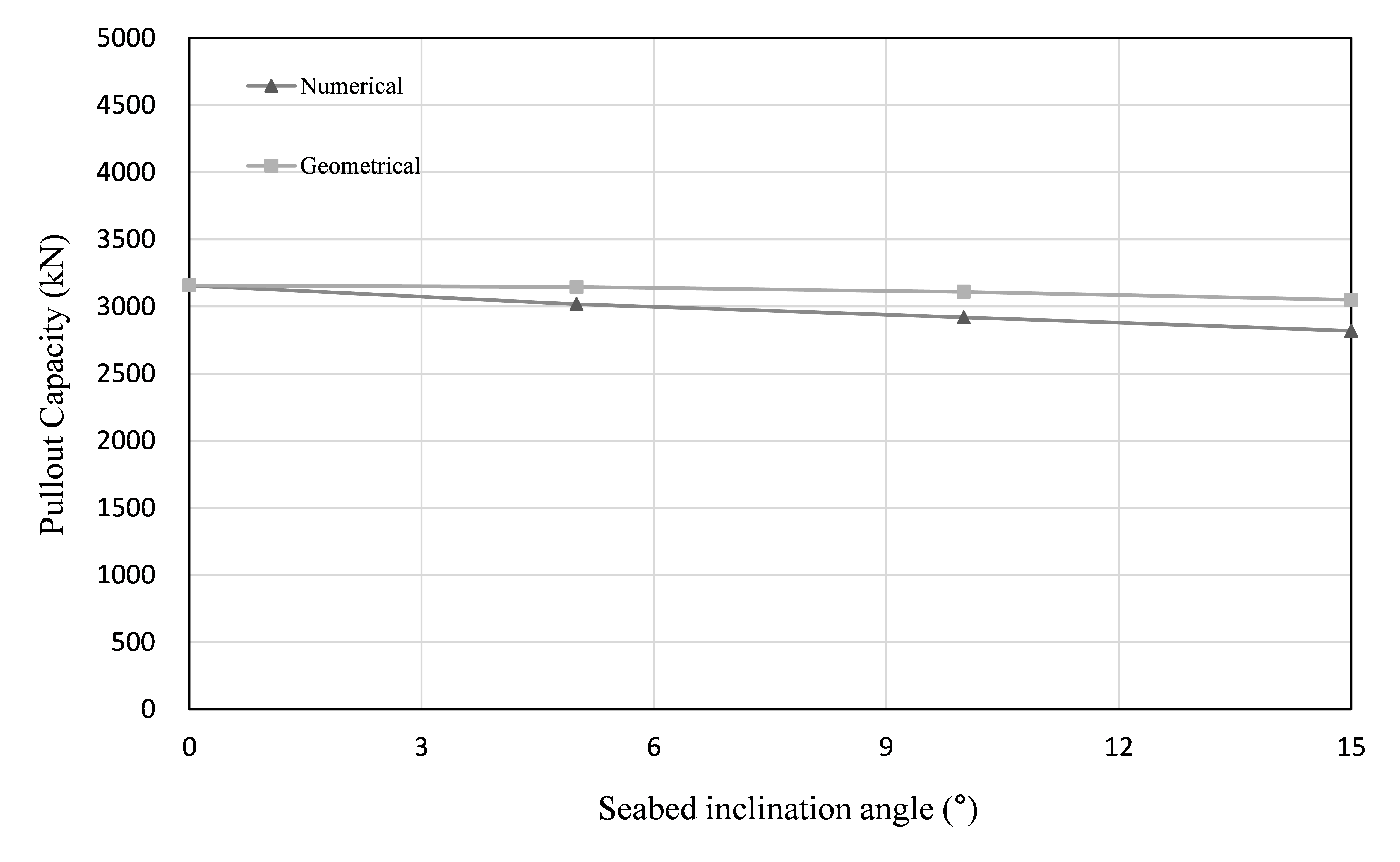 0°에서 기하학적 방법 인발지지력을 수치해석적 방법에서의 값 3157.20 kN으로 통일하였다. 두 방법 모두에서 경사각 증가에 따라 인발지지력이