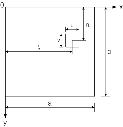 단순지지된 특별직교이방성 적층판에 대하여, Fig. 1과 같이 직사각형 면적 u×v에 균등하게 분포된 부분하중 q(x, y)가 작용할 때 m과 n의 고정된 값에 대한 푸리에 계수 qmn은 다음 Eq.