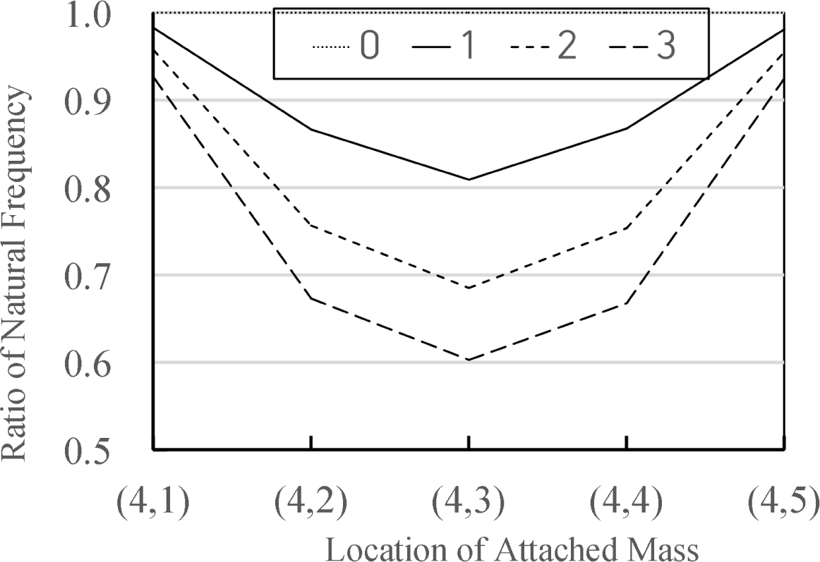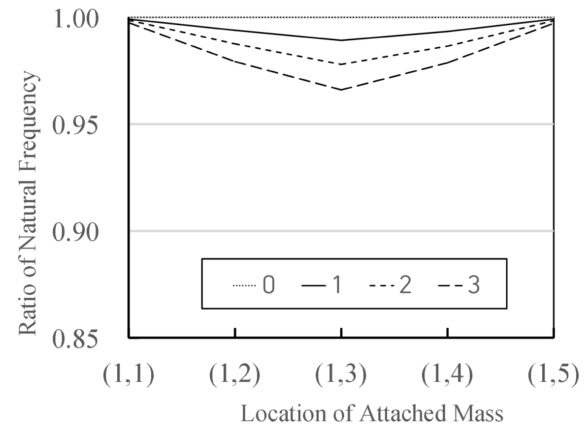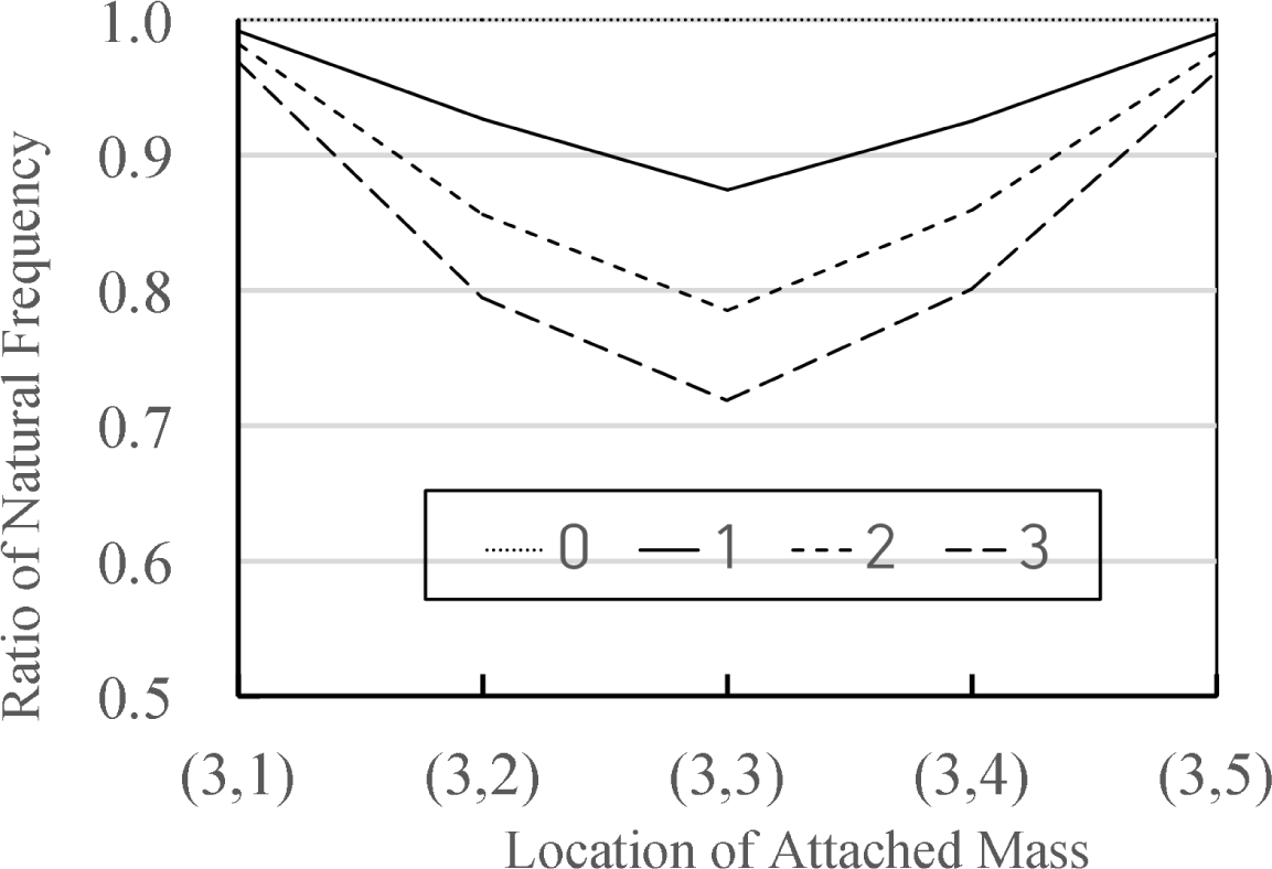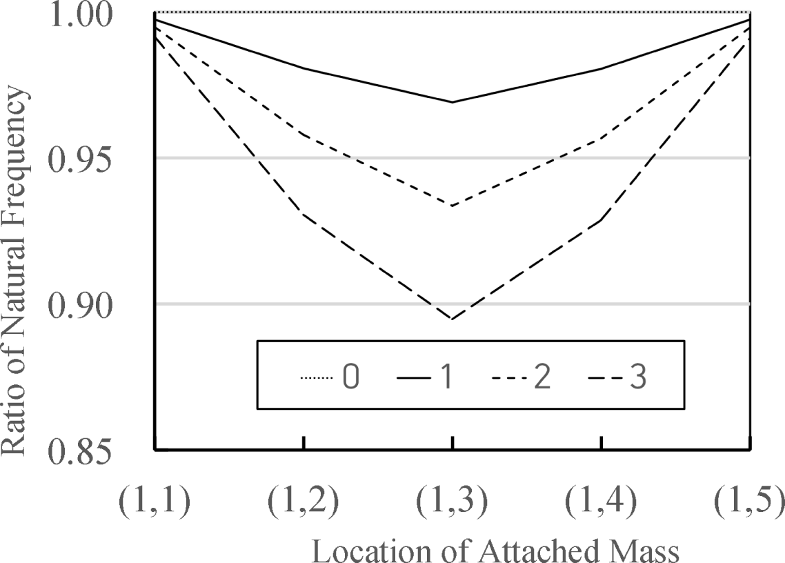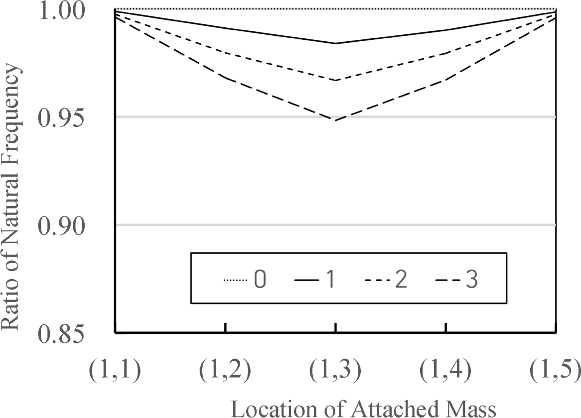 판의 자중과 (m1, n1)에 위치한 첨가질량을 동시에 고려할 경우에는 다음 Eq. (9)을 사용할 수 있다.