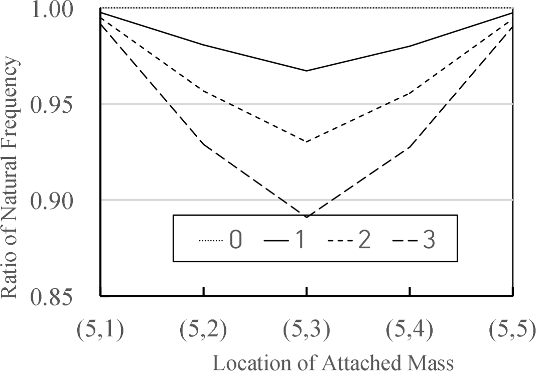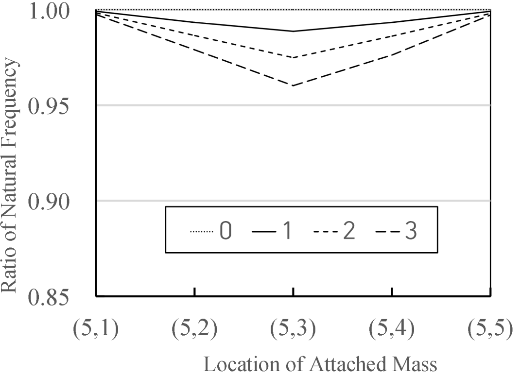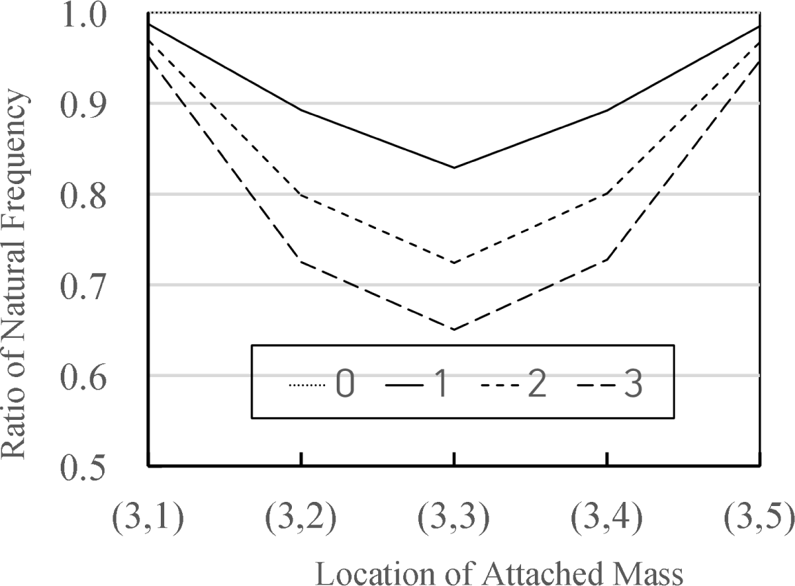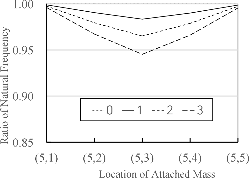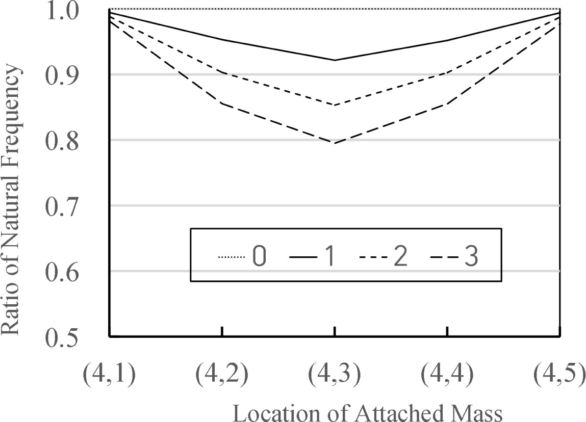 판의 자중과 (m1, n1)에 위치한 첨가질량을 동시에 고려할 경우에는 다음 Eq. (9)을 사용할 수 있다.