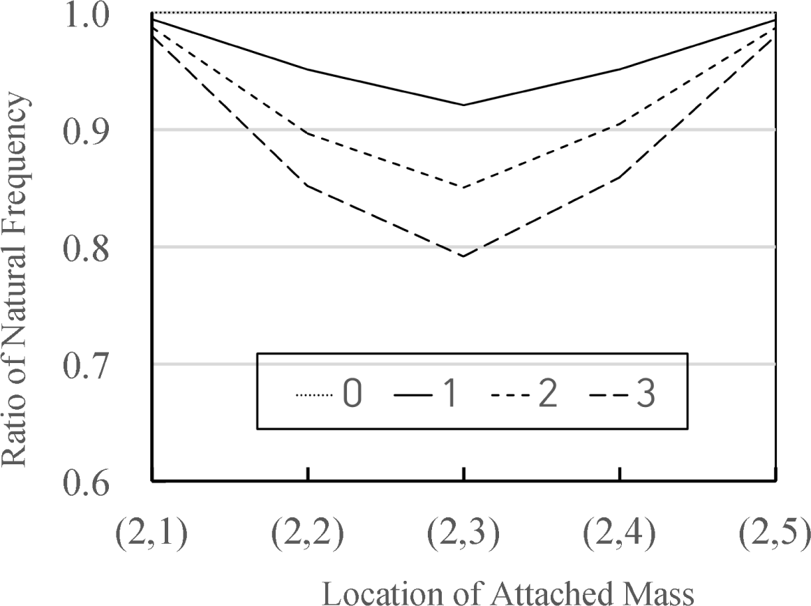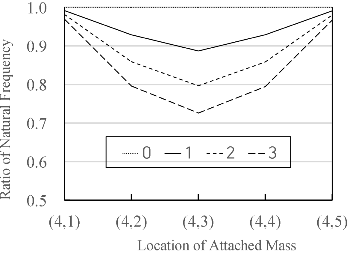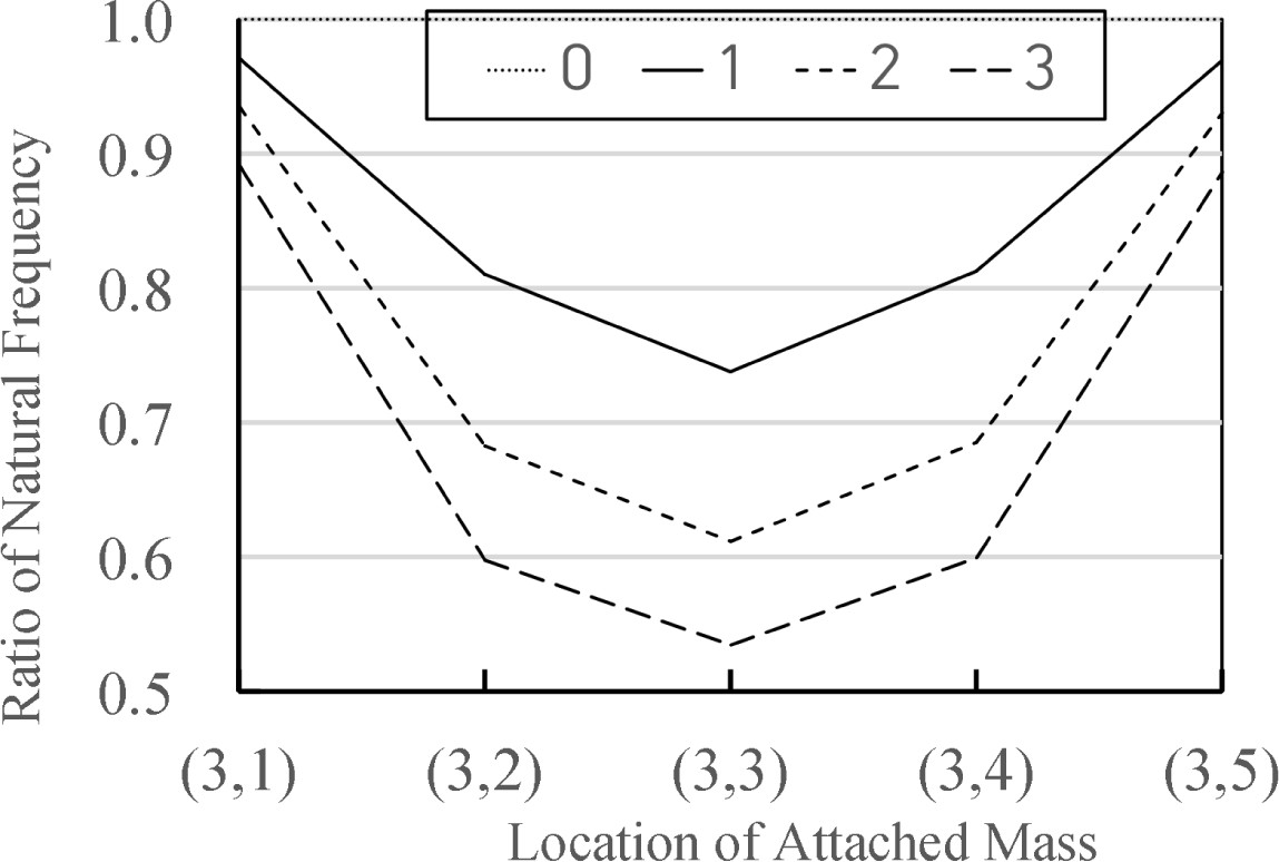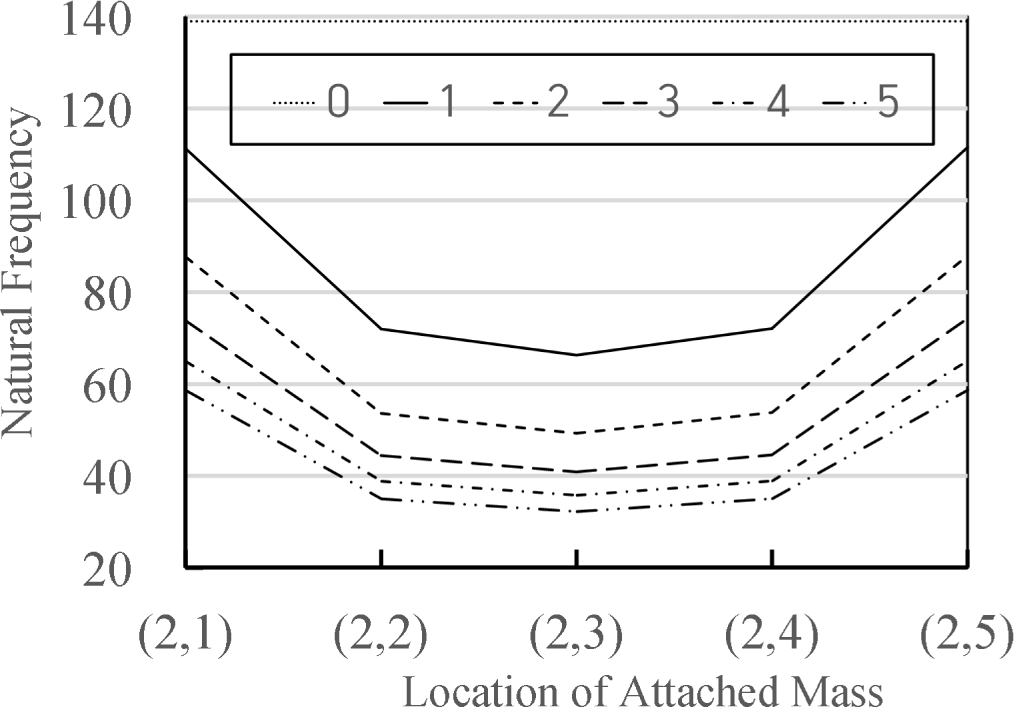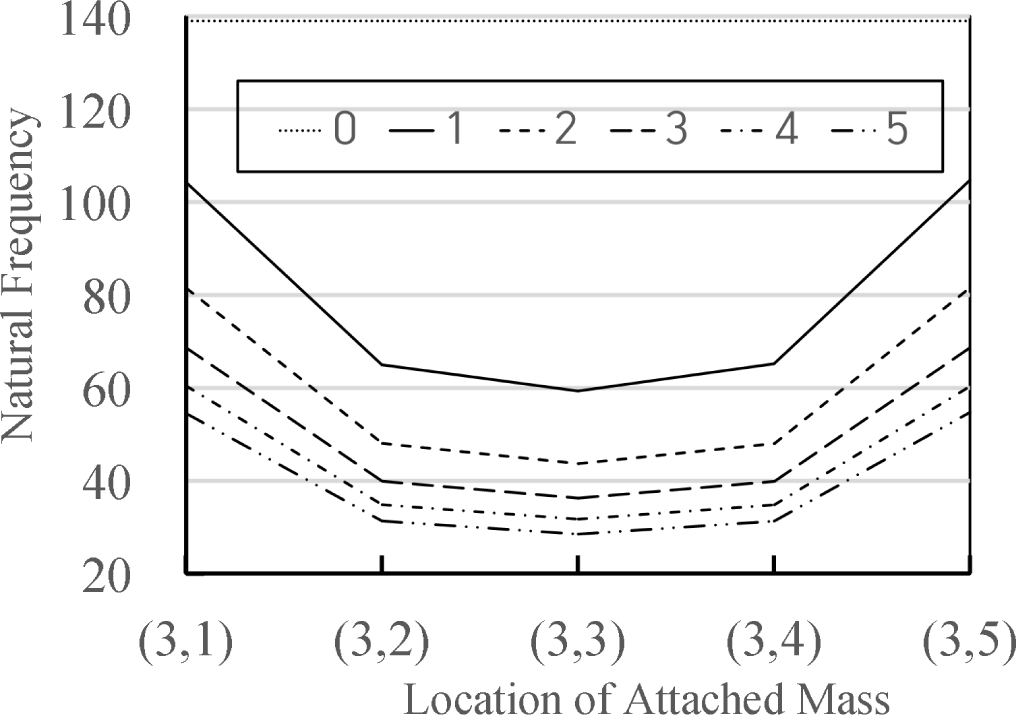 판의 자중과 (m1, n1)에 위치한 첨가질량을 동시에 고려할 경우에는 다음 Eq. (9)을 사용할 수 있다.