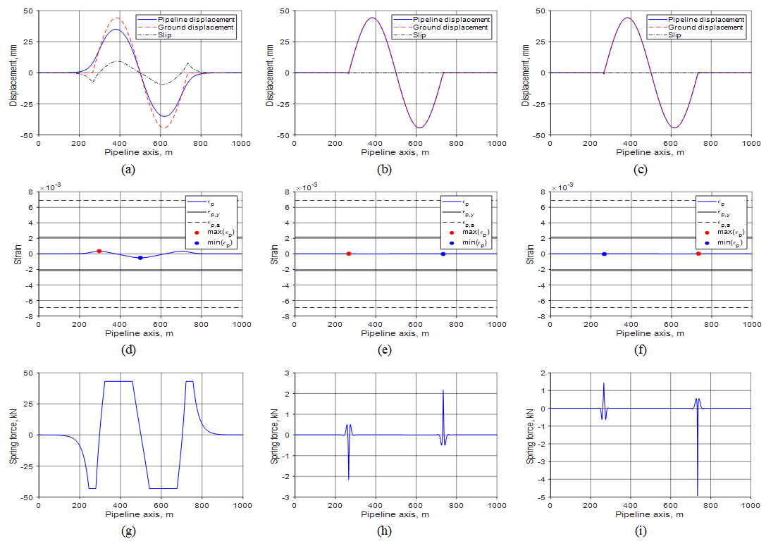 (f) Pipe Strain(VD), (g) Ground Spring Force(AD), (h) Ground Spring Force(HD), (i)