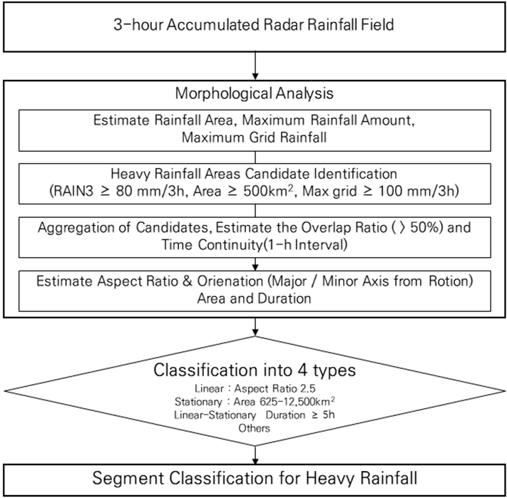 본 연구에서는 선형강수대와 집중호우(Heavy Rainfall Areas, HRAs)를 강우장에서 분리하는 알고리즘으로 Hirockawa et al. (2020)가 제시한 알고리즘을 적용한다. 적용한 알고리즘은 Fig. 2와 같다. 입력자료는 3시간 레이더 누적강우장(RAIN3)을 활용한다. 우선 최대 총누적 강우량, 최대 격자 강우강도, 강우면적을 계산한 후 8방향