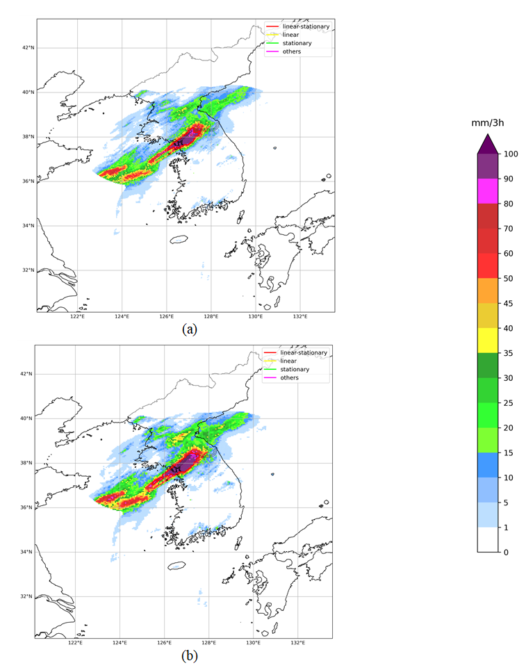 의해 확인된 바와 같이 선형-정체형 강수 특성을 나타내었다. 또한, 공간해상도 3 km일 때, 선형강수대의 형태학적 특성을 더 정교하게 분리할 수