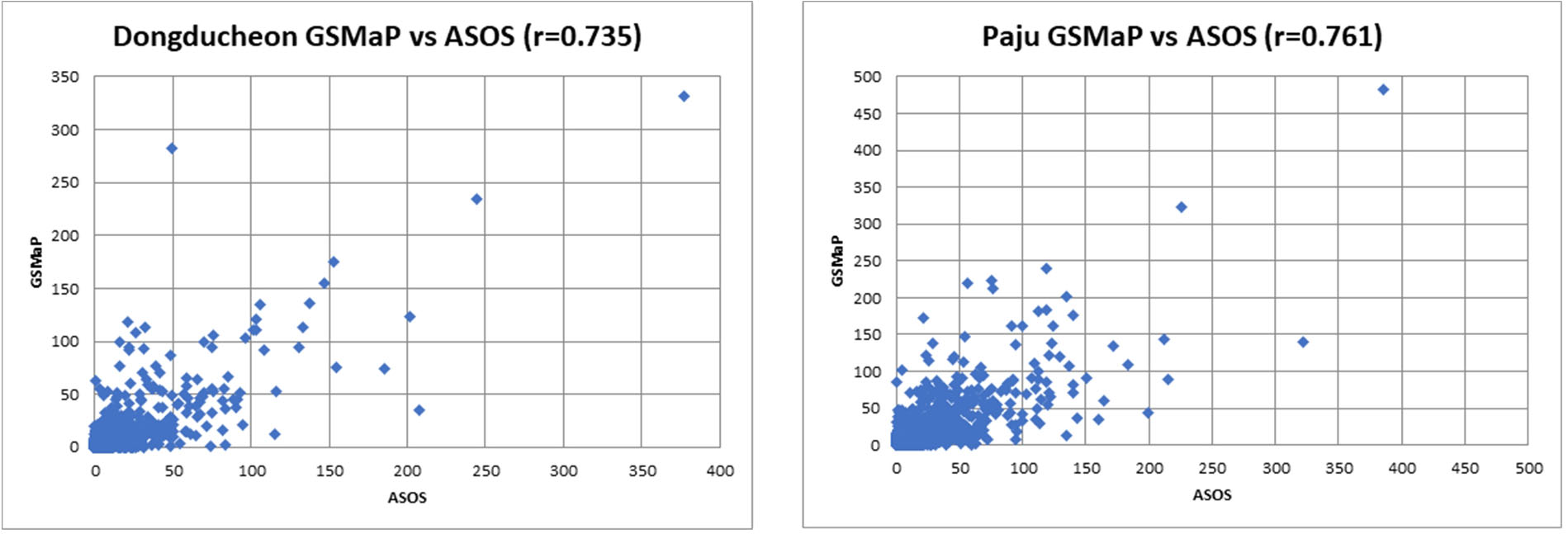 Kim et al.(2020b)은 2020년 8월 홍수에 대해 위성강수를 이용하여 남한의 3개 관측소 자료와 위성강수의 총강수를 분석한 결과 상관계수 0.996의 높은 상관관계가