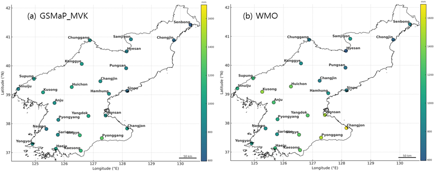 본 연구에서는 일본 JAXA에서 제공하는 GSMaP_MVK 위성강수자료(1999-2024)와 WMO GTS 기반의 북한 27개 관측소자료(2008-2024)를