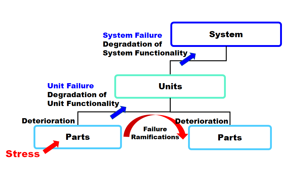 역학적, 화학적, 전자기적 요인을 포괄한다. 부품은 다양한 종류의 스트레스에 노출되며, 이로 인해 열화가 발생한다. 이러한 열화가 상위 계층으로 전파되어