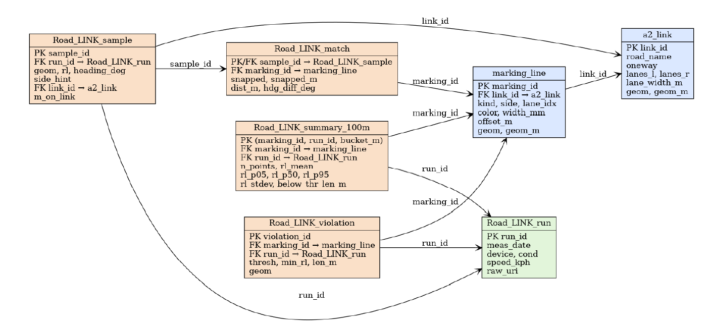 구체적으로, 조사 차량의 RTK GNSS 기반 계측 데이터를 Road_LINK_sample 테이블에 기록하며, 각 샘플은 marking_line 테이블의