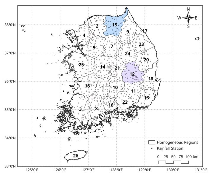 ๋ณธ ์—ฐ๊ตฌ์—์„œ๋Š” ๊ธฐ์กด ์ง€์นจ(ME, 2019)์— ๋”ฐ๋ผ ๊ตญ๊ฐ€์ˆ˜์ž์›๊ด€๋ฆฌ์ข…ํ•ฉ์ •๋ณด์‹œ์Šคํ…œ(Water Resources Management Information System, WAMIS)์—์„œ ์ œ๊ณตํ•˜๋Š” 615๊ฐœ ๊ฐ•์šฐ๊ด€์ธก์†Œ์˜ ์‹œ ๋‹จ์œ„ ๊ฐ•์šฐ ๊ด€์ธก์ž๋ฃŒ๋ฅผ ๋ถ„์„์— ํ™œ์šฉํ•˜์˜€๋‹ค. ํ˜„ํ–‰ ์ง€์นจ์˜ ๋นˆ๋„ํ•ด์„์€ ๊ด€์ธก ์‹œ์ž‘ ์—ฐ๋„๋ถ€ํ„ฐ 2017๋…„๊นŒ์ง€์˜ ์ž๋ฃŒ๋ฅผ ๊ธฐ๋ฐ˜์œผ๋กœ ์ˆ˜ํ–‰๋˜์—ˆ์œผ๋‚˜, ๋ณธ ์—ฐ๊ตฌ์—์„œ๋Š” 2018๋…„๋ถ€ํ„ฐ 2024๋…„๊นŒ์ง€ ์ด 7๋…„์˜ ์ž๋ฃŒ๋ฅผ ์ถ”๊ฐ€๋กœ ์ˆ˜์ง‘ํ•˜์—ฌ ํ™œ์šฉํ•˜์˜€๋‹ค. ๊ฐ ์ง€์ ์— ๋Œ€ํ•ด ์ง€์†๊ธฐ๊ฐ„๋ณ„๋กœ ์—ฐ์ตœ๋Œ€ ๊ฐ•์šฐ ๊ณ„์—ด(series)์„ ๊ตฌ์„ฑํ•˜์˜€๊ณ  ์ž๋ฃŒ ๊ฒ€์ฆ ๋ฐ ์ด์ƒ์น˜ ์ œ๊ฑฐ ๊ณผ์ •์„ ๊ฑฐ์ณ ์ž๋ฃŒ์˜ ์‹ ๋ขฐ์„ฑ์„ ํ™•๋ณดํ•˜์˜€๋‹ค. ๊ณ ์ •์‹œ๊ฐ„ ์—ฐ์ตœ๋Œ€์น˜ ์ž๋ฃŒ๋ฅผ ์ถ”์ถœํ•œ ํ›„, ํ™•๋ฅ ๊ฐ•์šฐ๋Ÿ‰๋„ ๊ฐœ์„  ๋ฐ ๋ณด์™„์—ฐ๊ตฌ(Ministry of Land, Transport and Maritime Affairs (MLTM), 2011)์—์„œ ์ œ์‹œํ•œ ์ž„์˜์‹œ๊ฐ„ํ™˜์‚ฐ๊ณ„์ˆ˜๋ฅผ ์ ์šฉํ•˜์—ฌ ์ž„์˜์‹œ๊ฐ„ ์—ฐ์ตœ๋Œ€์น˜ ๊ณ„์—ด๋กœ ์‚ฐ์ •ํ•˜์˜€๋‹ค. Fig. 1๊ณผ ๊ฐ™์ด ์ง€์—ญ ๊ตฌ๋ถ„์€ ๊ฐœ์ •๋œ ํ™์ˆ˜๋Ÿ‰ ์‚ฐ์ • ํ‘œ์ค€์ง€์นจ(ME, 2019)์— ๋”ฐ๋ผ 26๊ฐœ ๋™์งˆ์ง€์—ญ ์ฒด๊ณ„๋ฅผ ์ ์šฉํ•˜์˜€๋‹ค. ๊ทธ๋Ÿฌ๋‚˜ ์ตœ๊ทผ ๊ธฐํ›„๋ณ€ํ™”๋กœ ์ธํ•œ ๊ฐ•์šฐ ํŒจํ„ด์˜ ๋ณ€๋™์„ฑ ์‹ฌํ™”๋กœ ์ธํ•ด, ๊ธฐ์กด ์ง€์—ญ๋นˆ๋„ํ•ด์„์—์„œ ์‚ฌ์šฉ๋˜๋Š” 5๊ฐœ ํ™•๋ฅ ๋ถ„ํฌํ˜•(GLO, GEV, GNO, PE3, GPA)์— ๋Œ€ํ•ด ์ ํ•ฉ์„ฑ ๊ธฐ์ค€($|Z^{DIST}| \le 1.64$)์„ ๋งŒ์กฑํ•˜์ง€ ๋ชปํ•˜๋Š” ์ง€์—ญ์ด ๋ฐœ์ƒํ•˜์˜€๋‹ค. ์ด์— ๋ณธ ์—ฐ๊ตฌ๋Š” 26๊ฐœ ๋™์งˆ์ง€์—ญ ์ค‘ ๊ธฐ์กด 5๊ฐœ ๋ถ„ํฌํ˜•์— ๋ชจ๋‘ ๋ถ€์ ํ•ฉํ•œ ์ง€์—ญ์ธ 12๋ฒˆ ๋ฐ 15๋ฒˆ ์ง€์—ญ์„ ์ตœ์ข… ๋ถ„์„ ๋Œ€์ƒ์œผ๋กœ ์„ ์ •ํ•˜์˜€๋‹ค.
