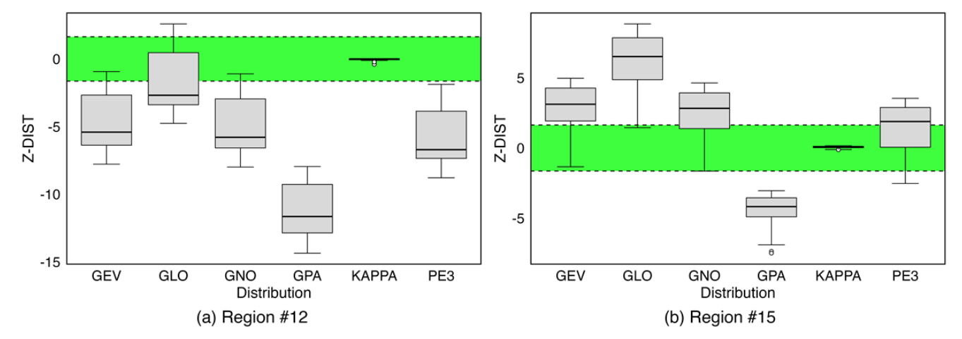 ๋ณธ ์—ฐ๊ตฌ๋Š” ๋Œ€์ƒ ์ง€์—ญ์— ๋Œ€ํ•ด ๊ธฐ์กด 5๊ฐœ ํ™•๋ฅ ๋ถ„ํฌํ˜•๊ณผ kappa ๋ถ„ํฌ ๊ฐ„์˜ ์ ํ•ฉ๋„๋ฅผ ๋น„๊ตํ•˜๊ธฐ ์œ„ํ•ด $Z^{DIST}$ ํ†ต๊ณ„๋Ÿ‰์„ ํ™œ์šฉํ•˜์—ฌ ๋ถ„์„ํ•˜์˜€๋‹ค(Fig. 2). Fig. 2(a), (b)์—์„œ ๋…น์ƒ‰ ์Œ์˜์€ ์ ํ•ฉ์„ฑ ํŒ๋‹จ ๊ธฐ์ค€์ธ ยฑ1.64 ๋ฒ”์œ„๋ฅผ ์˜๋ฏธํ•˜๋ฉฐ, ์ด ๋ฒ”์œ„ ๋‚ด์— ์œ„์น˜ํ•˜๋Š” ๊ฒฝ์šฐ ํ†ต๊ณ„์ ์œผ๋กœ ์ ํ•ฉํ•œ ๋ถ„ํฌํ˜•์œผ๋กœ ๊ฐ„์ฃผ๋œ๋‹ค. ๋‘ ์ง€์—ญ ๋ชจ๋‘ GEV, GLO, GNO, GPA, PE3 ๋ถ„ํฌ์—์„œ $Z^{DIST}$์˜ ์ค‘์•™๊ฐ’์€ ๊ธฐ์ค€ ๋ฒ”์œ„๋ฅผ ๋ฒ—์–ด๋‚ฌ์œผ๋ฉฐ ํ†ต๊ณ„์ ์œผ๋กœ ๋ถ€์ ํ•ฉํ•œ ๊ฒƒ์œผ๋กœ ๋‚˜ํƒ€๋‚ฌ๋‹ค. ์ƒˆ๋กญ๊ฒŒ ๋„์ž…ํ•œ kappa ๋ถ„ํฌํ˜•์€ ์ง€์ ์˜ ๋ชจ๋“  ์ง€์†๊ธฐ๊ฐ„๋ณ„ ์ ํ•ฉ์„ฑ ์ฒ™๋„๊ฐ€ ๊ธฐ์ค€ ๋ฒ”์œ„ ๋‚ด์— ์œ„์น˜ํ•˜์˜€๋‹ค. $Z^{DIST}$ ๊ธฐ์ค€์œผ๋กœ๋Š” ๋‘ ์ง€์—ญ ๋ชจ๋‘ kappa์—์„œ ๋†’์€ ์ ํ•ฉ๋„๋ฅผ ๋ณด์˜€๋‹ค.