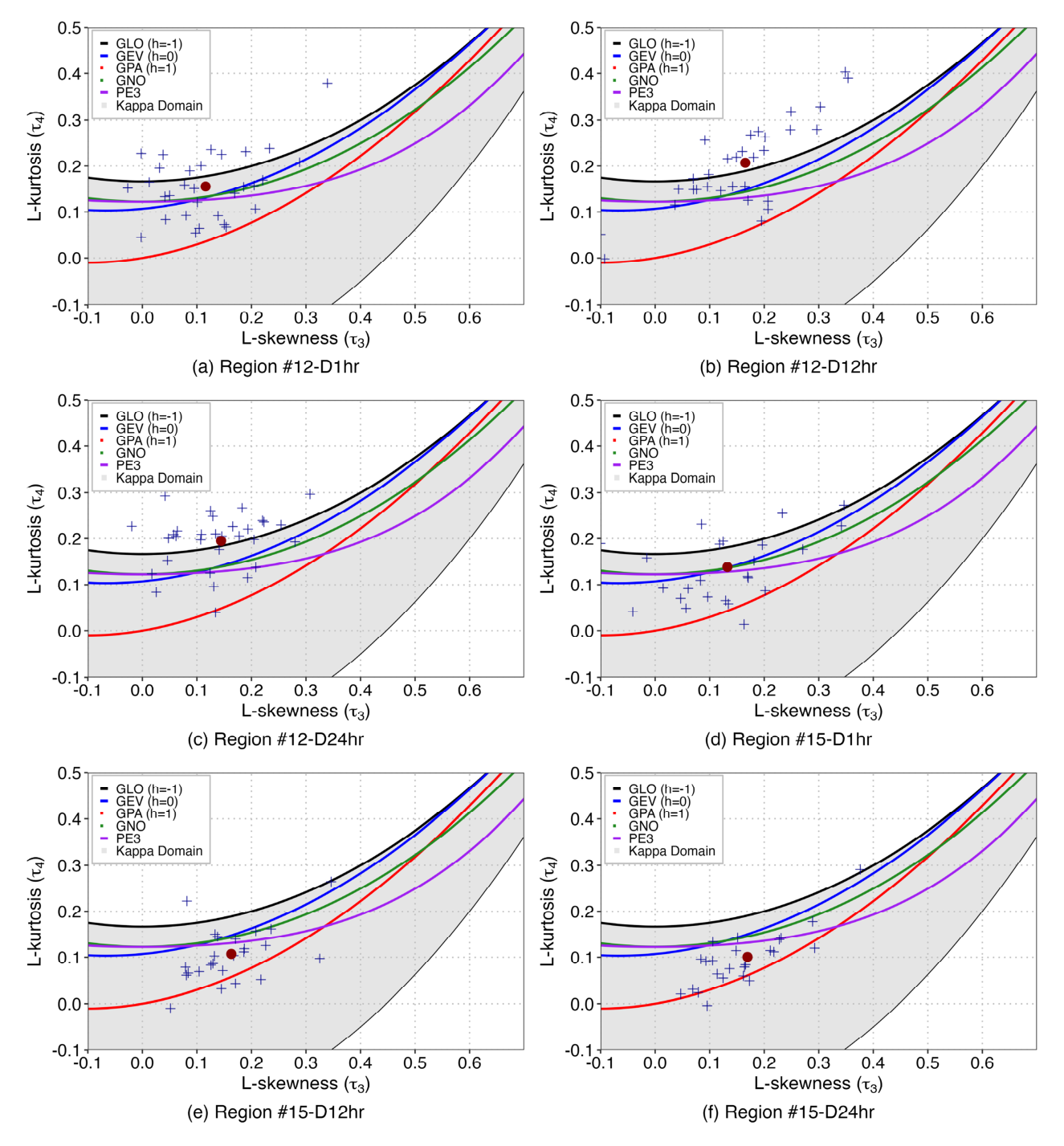 ์—ฌ๊ธฐ์„œ, kappa ๋ถ„ํฌ๋Š” $h \ge -1$ ์กฐ๊ฑด ํ•˜์— $\tau_3$๊ณผ $\tau_4$๋กœ ์ด๋ฃจ์–ด์ง„ L-moment ratio diagram ์ƒ์—์„œ ๊ณ ์œ ํ•œ ๊ณก์„ ์ด ์•„๋‹Œ ๊ด‘๋ฒ”์œ„ํ•œ ์˜์—ญ(Area)์„ ํฌ๊ด„ํ•˜์—ฌ ๋” ๋„“์€ ์ ํ•ฉ ๊ฐ€๋Šฅ์„ฑ์„ ์ œ๊ณตํ•œ๋‹ค(Hosking and Wallis, 2005).