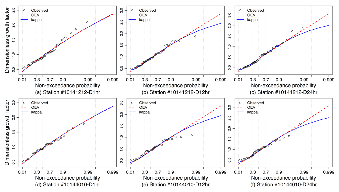 Fig. 4. Comparison of Probability Plots of Dimensionless Growth Factors for GEV and kappa Distributions in Station #10141212 and #10144010 (Duration: 1, 12, 24 hr)