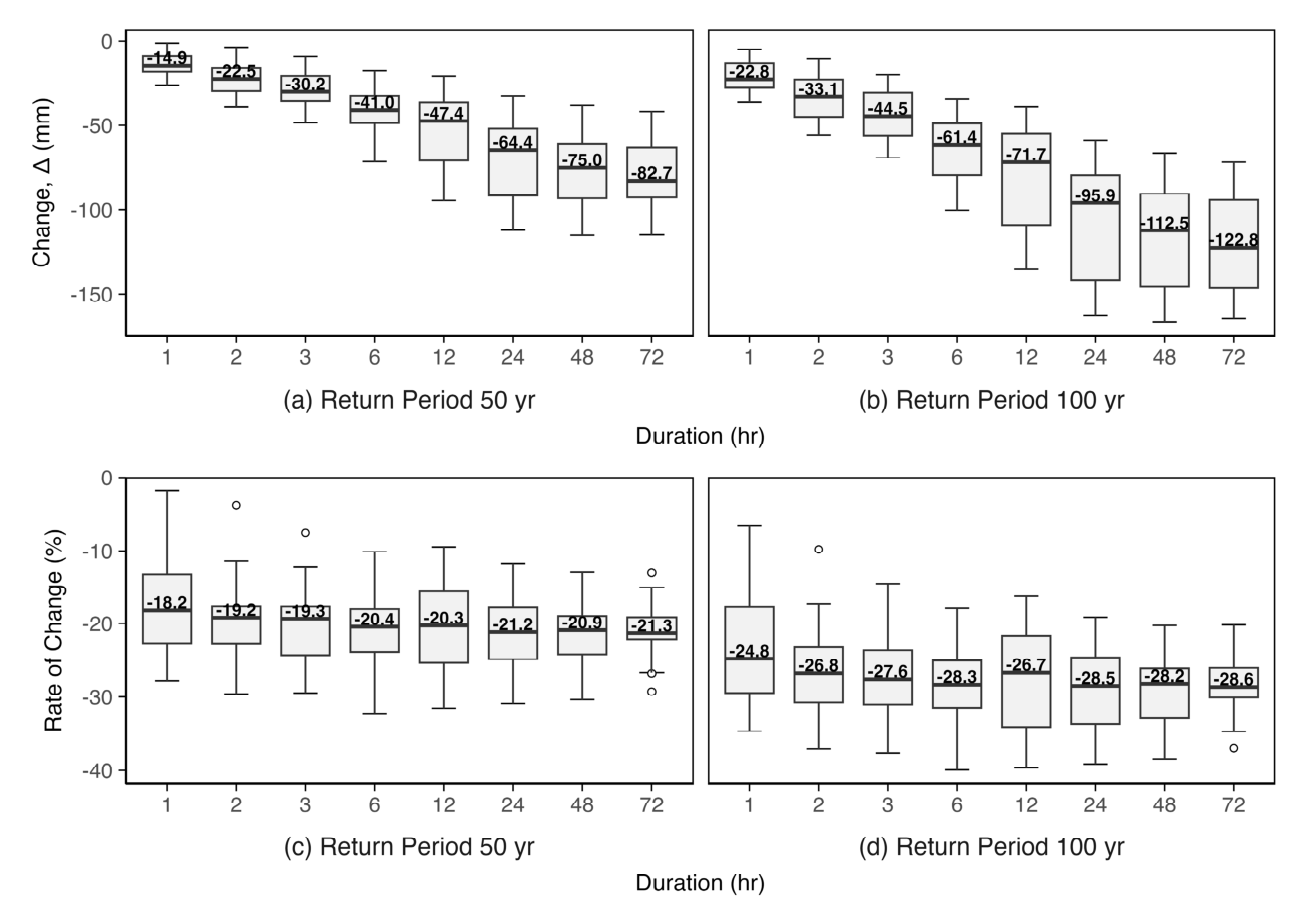 ์ด๋Ÿฌํ•œ ์‹œ๊ฐ์  ์ฐจ์ด๋ฅผ ์ •๋Ÿ‰์ ์œผ๋กœ ๊ทœ๋ช…ํ•˜๊ธฐ ์œ„ํ•ด ์ง€์†๊ธฐ๊ฐ„(1, 2, 3, 6, 12, 24, 48, 72์‹œ๊ฐ„) ๋ฐ ์žฌํ˜„๊ธฐ๊ฐ„(50, 100๋…„)์— ๋”ฐ๋ฅธ GEV ๋Œ€๋น„ kappa ๋ถ„ํฌํ˜•์˜ ํ™•๋ฅ ๊ฐ•์šฐ๋Ÿ‰ ๋ณ€ํ™”๋Ÿ‰ ($\Delta = Q_{Kappa} - Q_{GEV}$) ๋ฐ ๋ณ€ํ™”์œจ($Rate = \Delta / Q_{GEV} \times 100$)์„ ์‚ฐ์ •ํ•˜์—ฌ Fig. 5์— ๋„์‹œํ•˜์˜€๋‹ค. ํ™•๋ฅ ๊ฐ•์šฐ๋Ÿ‰์˜ ๋ณ€ํ™”๋Ÿ‰(Fig. 5(a), (b))์—์„œ ์žฌํ˜„๊ธฐ๊ฐ„ 50๋…„์˜ ๊ฒฝ์šฐ ์ง€์†๊ธฐ๊ฐ„ 1์‹œ๊ฐ„์—์„œ ์ค‘์•™๊ฐ’์ด -14.9 mm์˜€์œผ๋‚˜, 72์‹œ๊ฐ„์—์„œ๋Š” -82.7 mm๋กœ, ์žฌํ˜„๊ธฐ๊ฐ„ 100๋…„์˜ ๊ฒฝ์šฐ -22.8 mm์—์„œ -122.8 mm๋กœ ๊ทธ ์ฐจ์ด๊ฐ€ ํฌ๊ฒŒ ํ™•๋Œ€๋˜์—ˆ๋‹ค. ์ด๋Š” ๋ชจ๋“  ์ง€์†๊ธฐ๊ฐ„๊ณผ ์žฌํ˜„๊ธฐ๊ฐ„์—์„œ GEV๊ฐ€ kappa๋ณด๋‹ค ํฐ ํ™•๋ฅ ๊ฐ•์šฐ๋Ÿ‰์„ ์‚ฐ์ถœํ•˜๊ณ  ์žˆ์Œ์„ ์ˆ˜์น˜์ ์œผ๋กœ ๋ณด์—ฌ์คฌ๋‹ค. ํŠนํžˆ ์ง€์†๊ธฐ๊ฐ„ 6์‹œ๊ฐ„์—์„œ 12์‹œ๊ฐ„์œผ๋กœ ๋„˜์–ด๊ฐˆ ๋•Œ ๊ฐ’์˜ ์ฐจ์ด๊ฐ€ ์ƒ๋Œ€์ ์œผ๋กœ ์ฆ๊ฐ€ํ•จ๊ณผ ๋™์‹œ์—, boxplot์˜ interquartile range (IQR)์— ํ•ด๋‹นํ•˜๋Š” ๋ฐ•์Šค ๋†’์ด ๋˜ํ•œ ๊ธ‰๊ฒฉํžˆ ํ™•๋Œ€๋˜๋Š” ์–‘์ƒ์„ ๋ณด์˜€์œผ๋ฉฐ, ์ด๋Š” 12์‹œ๊ฐ„ ์ดํ›„ ๊ด€์ธก์†Œ ๊ฐ„ ๋ถ„์‚ฐ์˜ ํญ์ด ์ปค์ง€๋Š” ๊ฒƒ์œผ๋กœ ํŒ๋‹จ๋˜์—ˆ๋‹ค. ๋ณ€ํ™”์œจ(Fig. 5(c), (d)) ์—ญ์‹œ ์œ ์‚ฌํ•œ ๊ฒฝํ–ฅ์„ ํ™•์ธํ•˜์˜€๋‹ค. ๊ตฌ์ฒด์ ์œผ๋กœ ์žฌํ˜„๊ธฐ๊ฐ„ 50๋…„์—๋Š” -18.2 %์—์„œ -21.3 %๋กœ, 100๋…„์€ -24.8 %์—์„œ -28.6 %๋กœ ๋ถ„ํฌํ•˜๋ฉฐ ๋šœ๋ ทํ•œ ๊ฐ์†Œ ์ถ”์„ธ๋ฅผ ๋‚˜ํƒ€๋ƒˆ์œผ๋ฉฐ, ๊ฐ€์žฅ ํฐ ๊ฐ์†Œ ํญ์€ ์ค‘์•™๊ฐ’์„ ํ†ตํ•ด 72์‹œ๊ฐ„์ž„์„ ํ™•์ธํ•˜์˜€๋‹ค. ๋ณ€ํ™”์œจ์˜ ํŽธ์ฐจ๋Š” ๋ชจ๋“  ์žฌํ˜„๊ธฐ๊ฐ„์—์„œ 1์‹œ๊ฐ„๊ณผ 12์‹œ๊ฐ„์—์„œ ๊ฐ€์žฅ ํฌ๊ฒŒ ๋‚˜ํƒ€๋‚ฌ์œผ๋ฉฐ, ๋ณ€ํ™”๋Ÿ‰๊ณผ ์œ ์‚ฌํ•˜๊ฒŒ 6์‹œ๊ฐ„์—์„œ 12์‹œ๊ฐ„์œผ๋กœ ๋„˜์–ด๊ฐˆ ๋•Œ IQR์ด ์ฆ๊ฐ€ํ•˜๋Š” ํ˜„์ƒ์ด ํ™•์ธ๋˜์—ˆ๋‹ค.