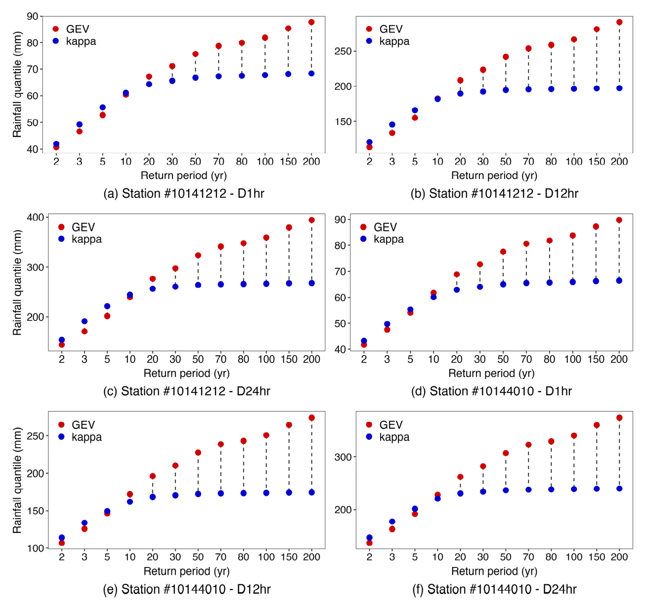 Fig. 4์—์„œ ๋Œ€ํ‘œํ–ˆ๋˜ ๊ด€์ธก์†Œ(#10141212, #10144010)๋ฅผ ๋Œ€์ƒ์œผ๋กœ, ์ง€์†๊ธฐ๊ฐ„ 1, 12, 24์‹œ๊ฐ„์— ๋Œ€ํ•ด kappa์™€ GEV ๋ถ„ํฌ๋กœ๋ถ€ํ„ฐ ์‚ฐ์ •๋œ ํ™•๋ฅ ๊ฐ•์šฐ๋Ÿ‰์„ Fig. 6์— ์ œ์‹œํ•˜์˜€๋‹ค. ์žฌํ˜„๊ธฐ๊ฐ„์— ๋”ฐ๋ฅธ ํ™•๋ฅ ๊ฐ•์šฐ๋Ÿ‰์˜ ๊ทœ๋ชจ ๋ฐ ๋ณ€ํ™” ์–‘์ƒ์„ ๋„์‹œํ•จ์œผ๋กœ์จ, ๋ถ„ํฌํ˜•์˜ ์„ ํƒ์ด ๊ฒฐ๊ณผ์— ๋ฏธ์น˜๋Š” ์˜ํ–ฅ์„ ๊ด€์ธก์†Œ๋ณ„๋กœ ์ง๊ด€์ ์œผ๋กœ ํ™•์ธํ•˜์˜€๋‹ค. ์ผ๋ฐ˜์ ์ธ ์ˆ˜๋ฌธํ•™์  ํŠน์„ฑ์— ๋”ฐ๋ผ ์žฌํ˜„๊ธฐ๊ฐ„์ด ๊ธธ์–ด์งˆ์ˆ˜๋ก ํ™•๋ฅ ๊ฐ•์šฐ๋Ÿ‰๋„ ์ฆ๊ฐ€ํ•˜์˜€์œผ๋‚˜, ํŠน์ • ์žฌํ˜„๊ธฐ๊ฐ„์„ ๊ธฐ์ ์œผ๋กœ ๋‘ ๋ถ„ํฌํ˜• ๊ฐ„์˜ ์šฐ์—ด ๊ด€๊ณ„๊ฐ€ ์ „ํ™˜๋˜์—ˆ๋‹ค. ๊ด€์ธก์†Œ #10141212์˜ ๊ฒฝ์šฐ, ๋‚ฎ์€ ์žฌํ˜„๊ธฐ๊ฐ„(์ง€์†๊ธฐ๊ฐ„ 1, 12์‹œ๊ฐ„์—์„œ๋Š” ์žฌํ˜„๊ธฐ๊ฐ„ 10๋…„; ์ง€์†๊ธฐ๊ฐ„ 24์‹œ๊ฐ„์—์„œ๋Š” ์žฌํ˜„๊ธฐ๊ฐ„ 5๋…„) ์ดํ•˜์—์„œ๋Š” kappa ๋ถ„ํฌ๊ฐ€ ๋” ํฐ ๊ฐ’์„ ๋ณด์˜€์œผ๋‚˜, ์ดํ›„ ์žฌํ˜„๊ธฐ๊ฐ„์ด ์ฆ๊ฐ€ํ•จ์— ๋”ฐ๋ผ GEV ๋ถ„ํฌ๊ฐ€ ์ด๋ฅผ ์ƒํšŒํ•˜๋Š” ์—ญ์ „ ํ˜„์ƒ์ด ๋ฐœ์ƒํ•˜์˜€๋‹ค(Fig. 6(a), (b), (c)). ๊ด€์ธก์†Œ #10144010์—์„œ๋„ ์žฌํ˜„๊ธฐ๊ฐ„ 5๋…„์„ ๊ธฐ์ ์œผ๋กœ ํ™•๋ฅ ๋ถ„ํฌํ˜• ๊ฐ„ ์ƒ๊ด€๊ด€๊ณ„๊ฐ€ ๋ฐ˜์ „๋˜๋Š” ๋™์ผํ•œ ๊ฒฝํ–ฅ์ด ๊ด€์ฐฐ๋˜์—ˆ๋‹ค(Fig. 6(d), (e), (f)).