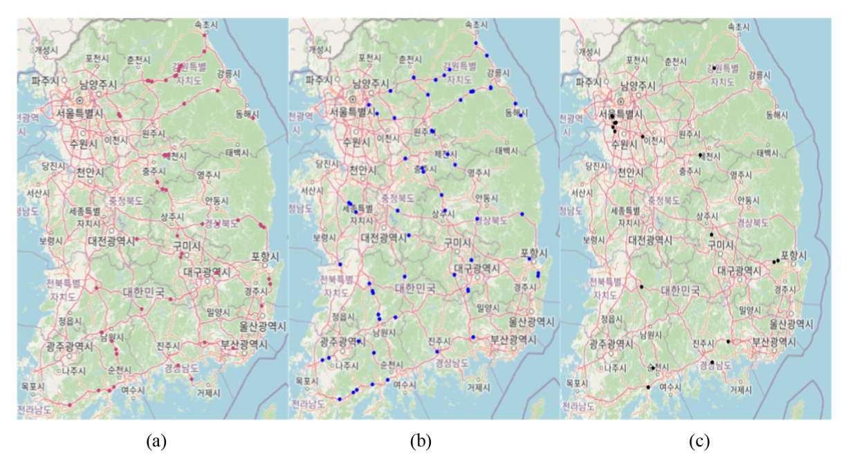 Fig. 2. GIS Mapping of Analysis Tunnels. (a) Cluster0, (b) Cluster1, (c) Cluster2