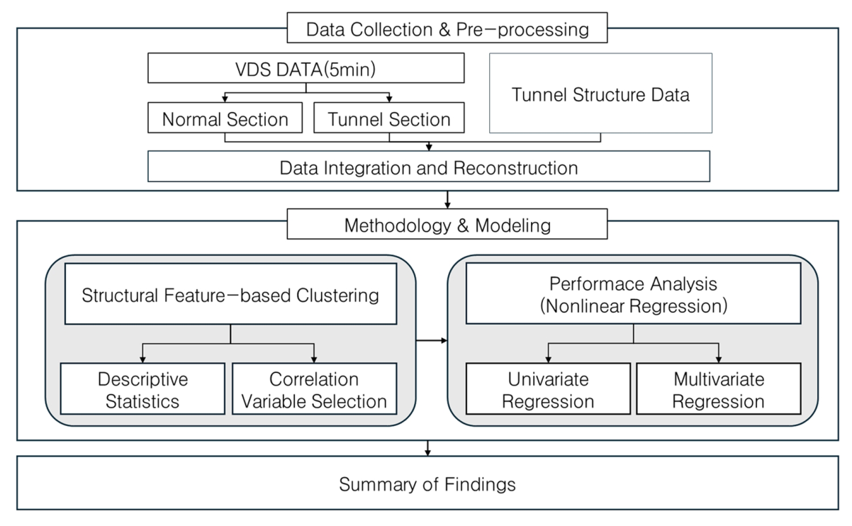 본 연구는 터널 구간의 구조적 특성이 교통 성능에 미치는 영향을 규명하기 위하여, 구조 변수 기반 군집분석과 군집별 비선형 회귀분석을 단계적으로 수행하였다.
