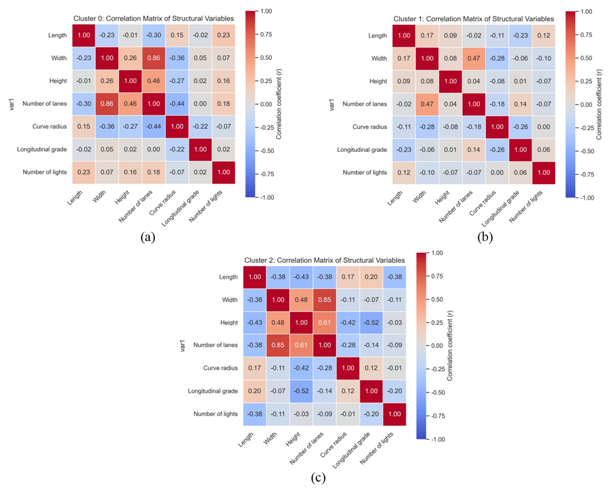 Fig. 4. Correlation Heatmaps of Structural Variables within Each Tunnel Cluster. (a) Cluster0, (b) Cluster1, (c) Cluster2