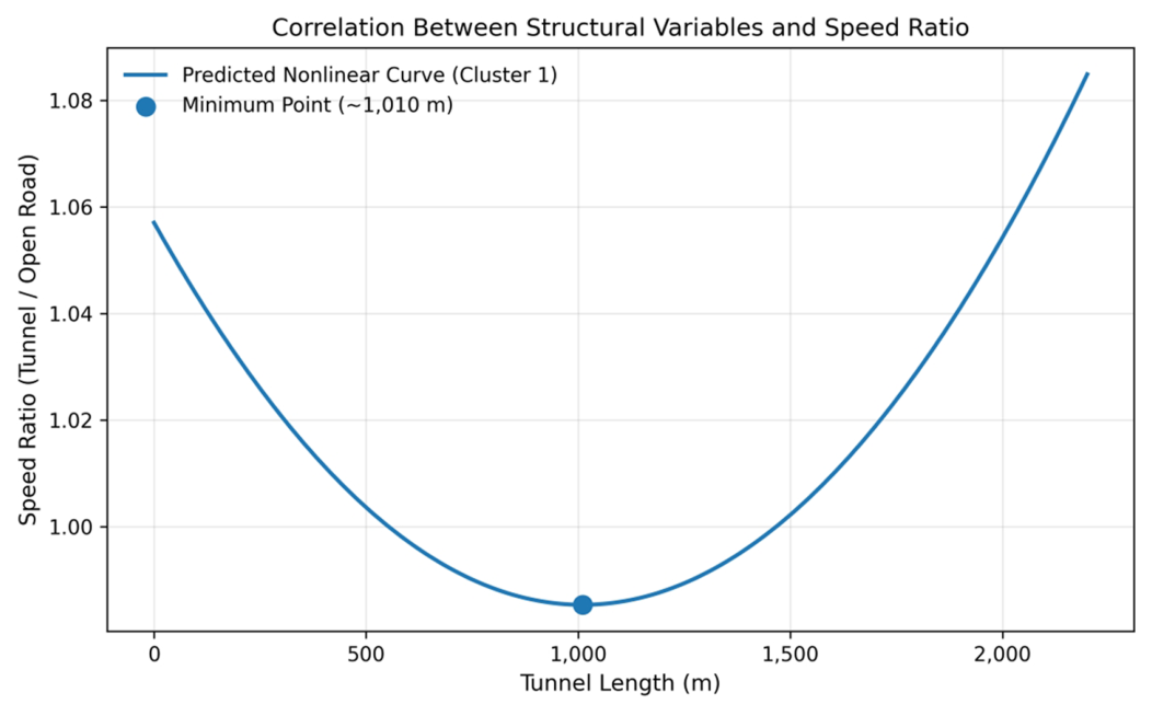 터널 길이에 따른 속도 감소 메커니즘을 정밀하게 규명하기 위한 비선형 회귀분석 결과 길이 효과는 특정 구조 유형에서만 통계적으로 유효하게 작용하였다. 구조적 제약이 큰 군집의 경우 터널 길이의 1차항 계수는 약 -1.4 × 10-4, 2차항 계수가 약 +7.0 × 10-8로 추정되었으며 두 계수 모두 유의수준 1 % 이내에서 통계적 유의성을 확보하였다. 해당 회귀식은 터널 연장이 증가함에 따라 속도비가 감소하되 그 감소율이 일정 지점 이후 완화되는 비선형 관계를 내포한다. 특히 도출된 식을 분석한 결과 속도 감소 효과는 터널 길이 약 1.0 km 전후에서 최댓값을 갖는 것으로 나타났다. 이는 터널 진입 후 약 1 km까지는 구조적 폐쇄성에 따른 운전자의 시각적 압박 및 거동 변화 감속 효과가 누적되지만 그 이후에는 운전자의 주행 환경 적응으로 인해 추가적인 길이 증가가 직접적인 속도 감소로 이어지지 않음을 수리적으로 뒷받침한다.