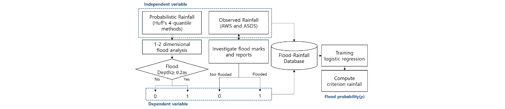 확률강우량과 1-2차원해석 결과 그리고 실측 강우 및 침수 기록을 이용하여 강우량에 따른 침수 발생 유무의 범주형 자료 세트를 구성하였으며, 이를