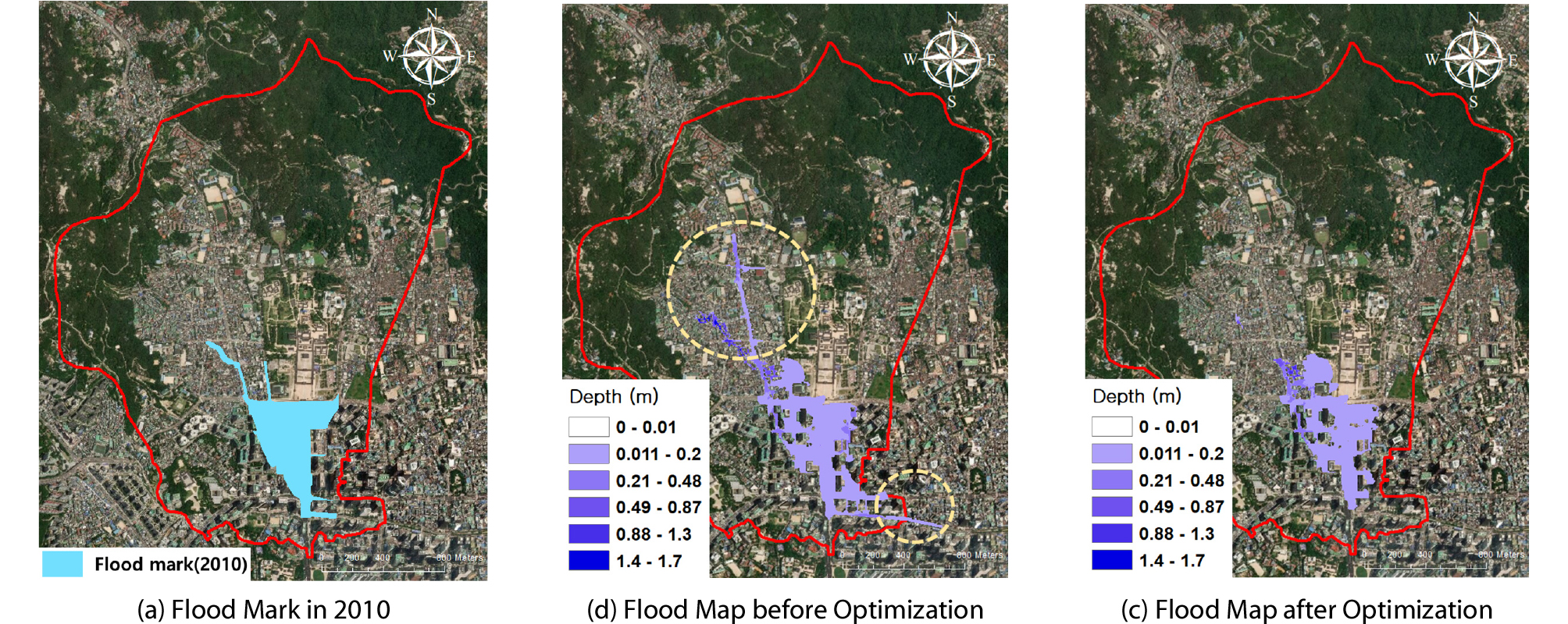 최적화를 수행하였다. 추가적으로 AWS 및 종관기상관측 강우 자료와 서울시 풍수해저감종합계획 보고서 및 침수흔적도를 이용하여, 침수를 일으킨 실측