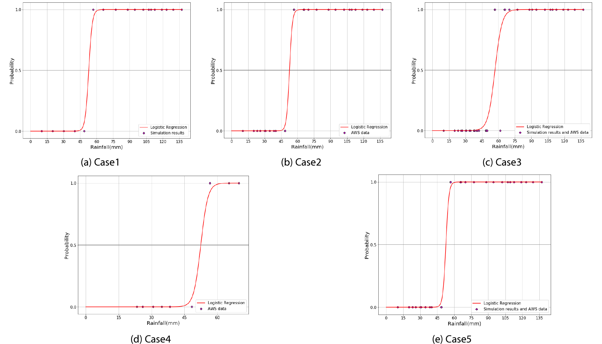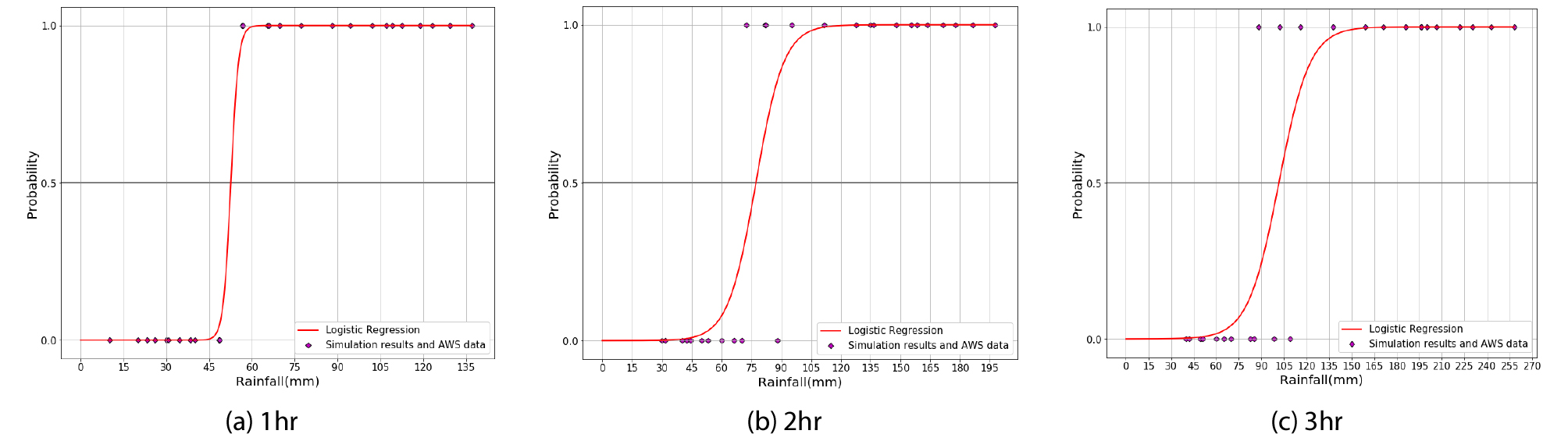 강우를 조사하였다. 각 확률 및 실측 강우량에 대한 침수 여부를 정리하여 범주형 데이터 세트를 생성하고 로지스틱 회귀에 입력하였다. 이에 특정 강우량에