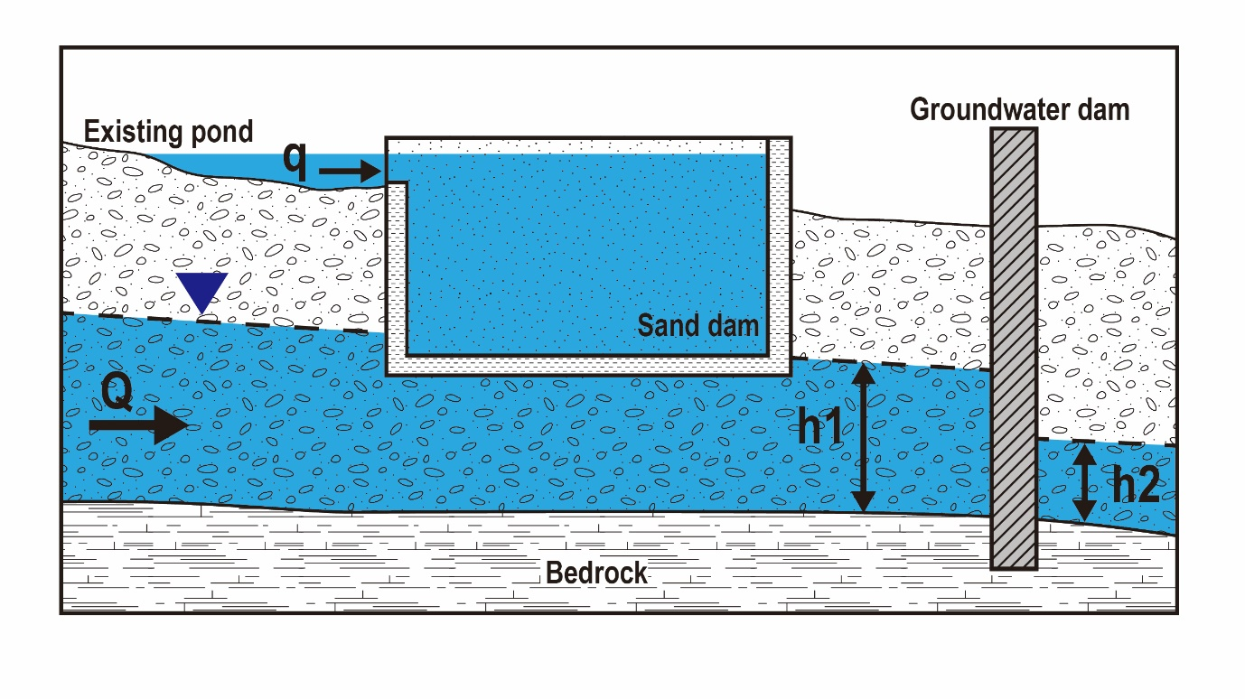 상단에 위치하며 인근 하천 상류에서 유입된 지표수를 보관하고 샌드댐으로 방출(q)하는 역할을 한다. 샌드댐은 물을 저장하고 운영 계획에 따라 서서히