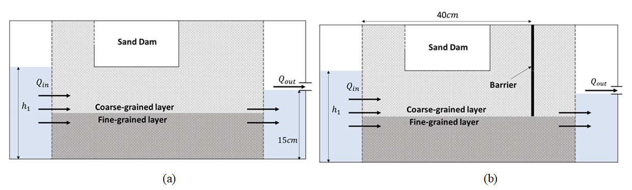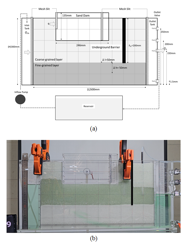 실험에 사용된 샌드댐 모형과 지하댐을 형상화한 차수벽은 다양한 실험조건에서 유연하게 대응할 수 있도록 탈착 가능한 구조로 제작하였다. 본 연구에서는