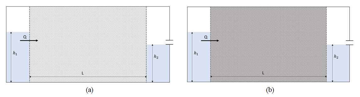 이 실험은 매개변수인 수리전도도 산정을 위한 실험이며 Fig. 3은 (a) 입자 크기가 비교적 큰 매질 및 (b) 입자 크기가 비교적 작은 다공성 매질의 수리전도도를 산정을 위한 실내 실험 장치의 개념도를 나타낸