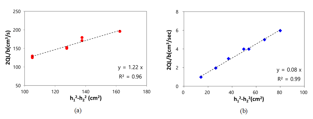 이때 Q는 유량[L3/T], K는 수리전도도[L/T], L은 흐름 길이 또는 실험장치의 수평방향 길이[L], b는 실험체의 두께[L], h1과 h2는