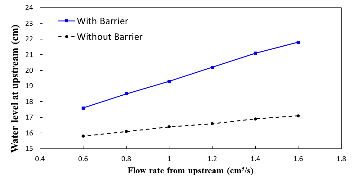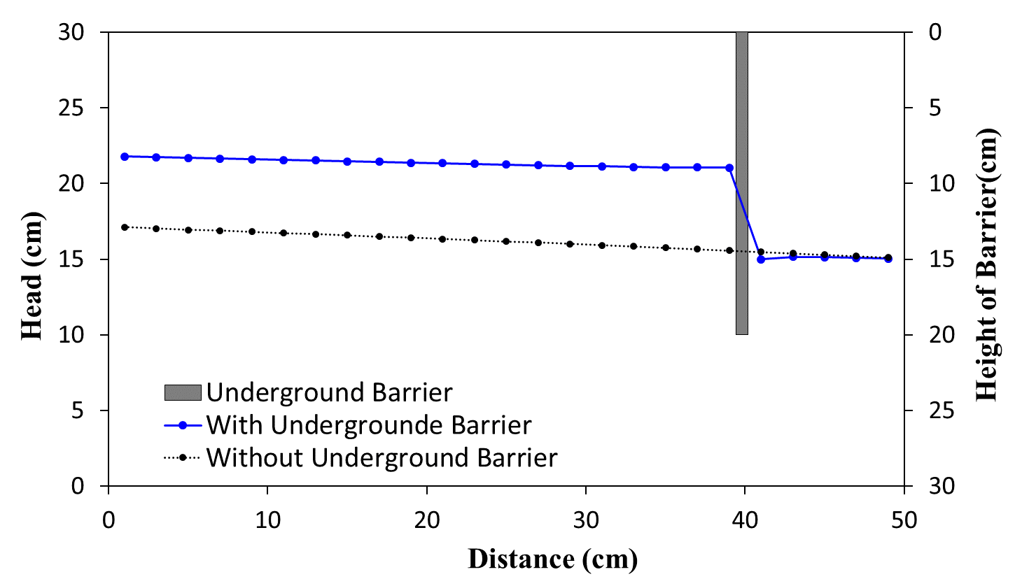 벽체가 설치되지 않은 경우 상류 수두는 17.1 cm로 나타났으며, 차수벽 설치 시에는 상류 지하수위가 21.8 cm로 상승하여 실험 관측값과 유사한