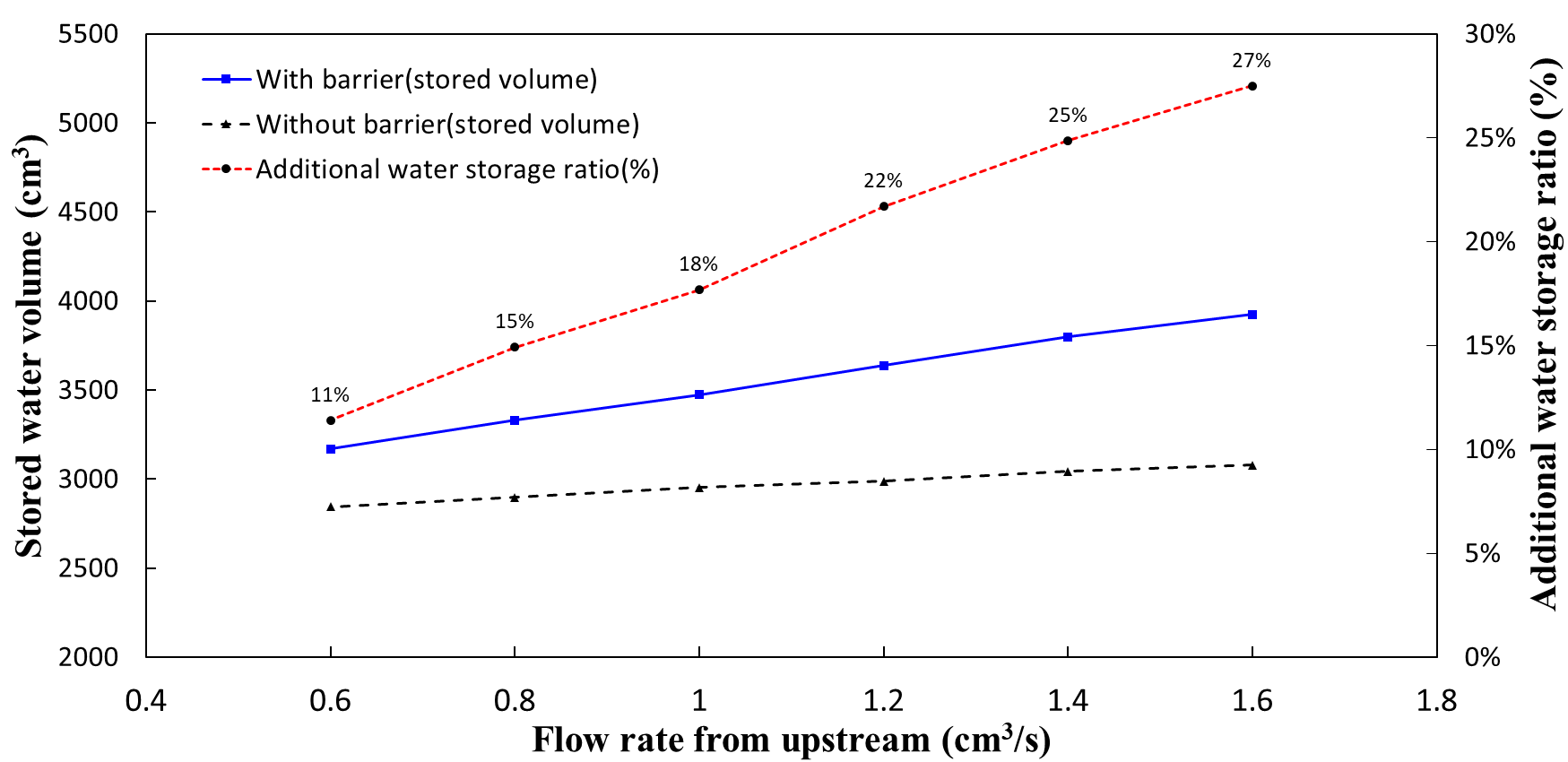 마지막으로, 차수벽 설치로 인해 확보 가능한 물의 양을 정량화하기 위해 추가 지하수 확보율을 분석한 결과, 유입 유량이 0.6 cm3/s일 때는 11 %의 추가 저장 효과가 나타났으며, 유입 유량이 1.6 cm3/s로 증가할 경우에는 최대 27 %까지 물의 저장량이 증가하는 것으로 나타났다. 이는 유입 유량이 많을수록 벽체 설치에 따른 저장 효율이 더욱 향상된다는