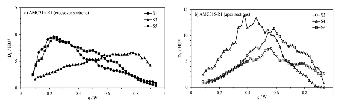 apex)에서의 종분산계수가 교차부(cross-over)에서의 값보다 매우 높게 나타남을 알 수 있다. 또한 각 단면에서의 종분산계수 최댓값은 Elder(1959)가 이론적으로 유도한 값의 2배 이상으로 나타나고 있음을 알 수 있다. 이로써 Elder(1959)가 이론식을 유도할 때 도입한 가정이 불규칙한 수로나 자연하천의 경우에는 적합하지 않음을 알 수 있다.