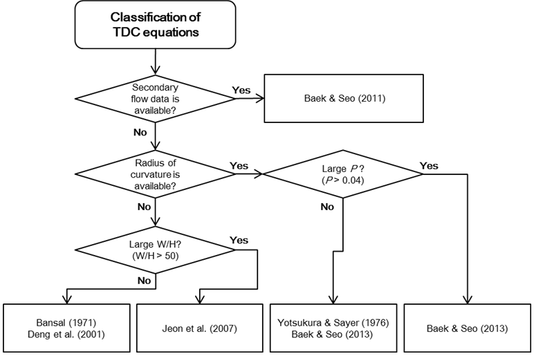 Baek and Seo(2017)는 상술한 경험식들의 정확도를 비교하여 수리적 조건에 따른 활용 방안을 Fig. 4와 같이 제시하였다. 우선 이차류에 관한 실측 자료가 존재한다면 Baek and Seo(2011)가 제안한 Eq. (13)이 적합한 것으로 추천하였다. 하천의 사행도 특성을 알 수 있다면, $P$ 값에 따라 다음과 같이 제안하였다. $P$ 값이 0.04보다 작을 경우에는