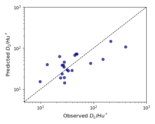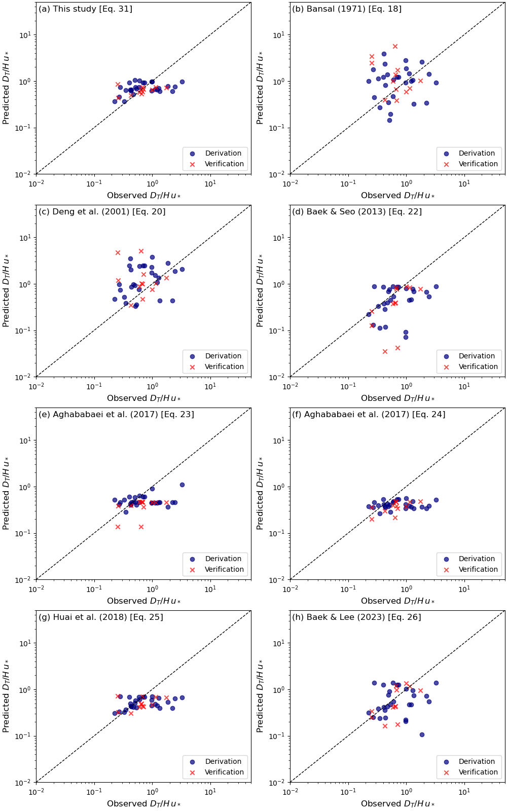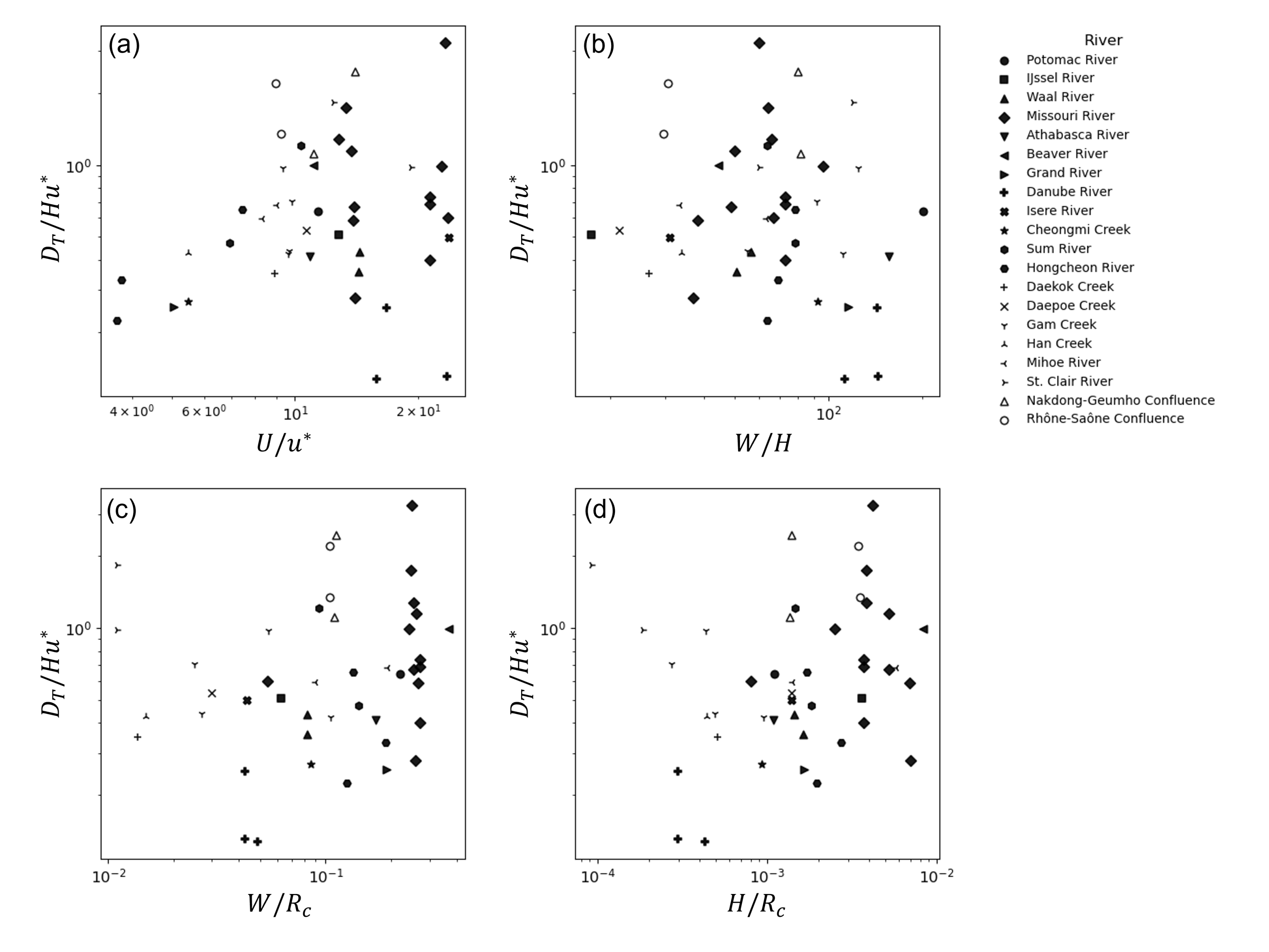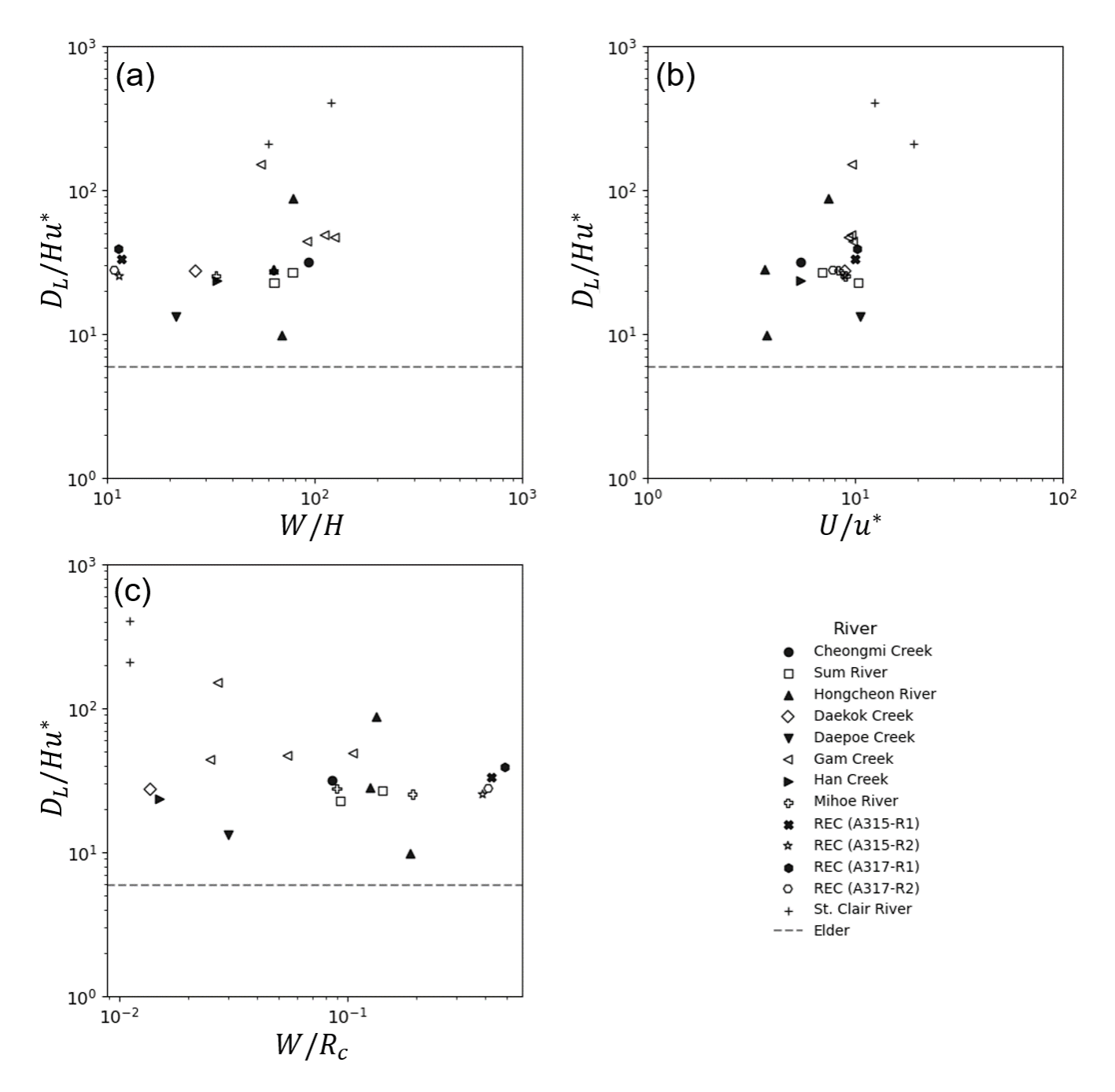 상술한 이론식의 경우 무차원화된 횡분산계수가 모두 $\dfrac{U}{u^{*}},\: \dfrac{H}{R_{c}},\: \dfrac{W}{R_{c}}$의
