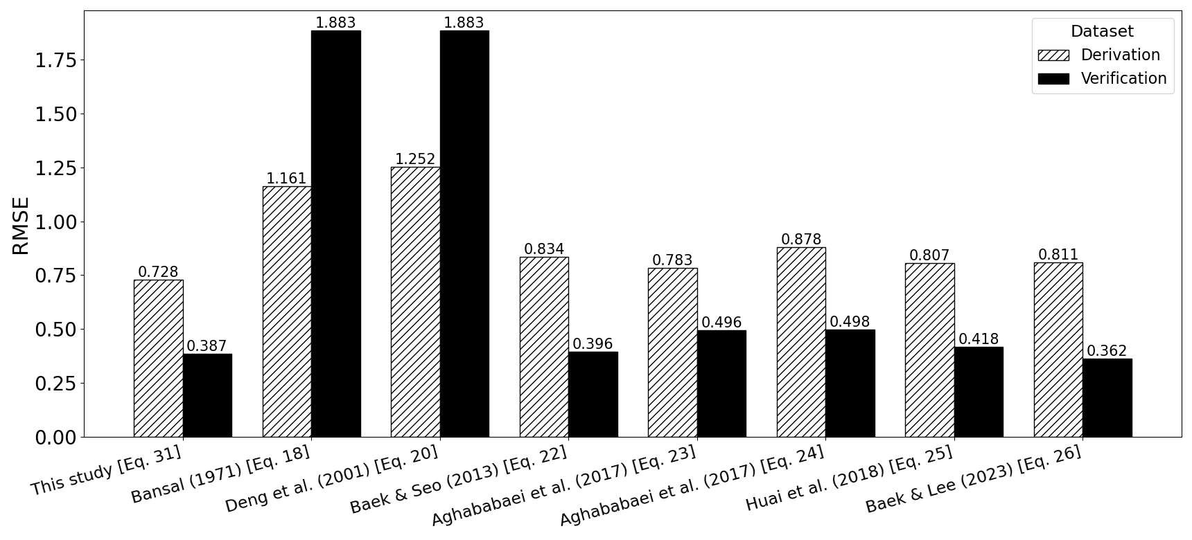 $\dfrac{W}{H}$값이 50보다 작을 경우에는 Bansal(1971)에 의한 Eq. (18)과 Deng et al.(2001)이 제안한 Eq. (20)을 사용하는 것을 권장하였고, $\dfrac{W}{H}$값이 50보다 큰 경우에는 Jeon et al.(2007)에 의한 Eq. (21)을 추천하였다.