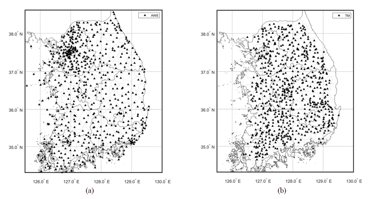 Fig. 3과 같다. AWS는 주로 수도권 및 해안·도서 지역에서 조밀하게 분포를 이루었으며, TM은 하천 중상류 지역에서 조밀하고 고도가 상대적으로 높은 곳에서