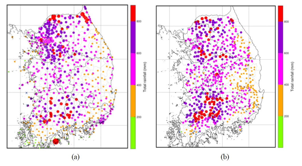관측된 AWS 관측소 총 713개 지점의 총 강우량 평균은 480.1 mm이고 724개소 TM 지점 평균은 547.2 mm로 산정되었다. 두 자료