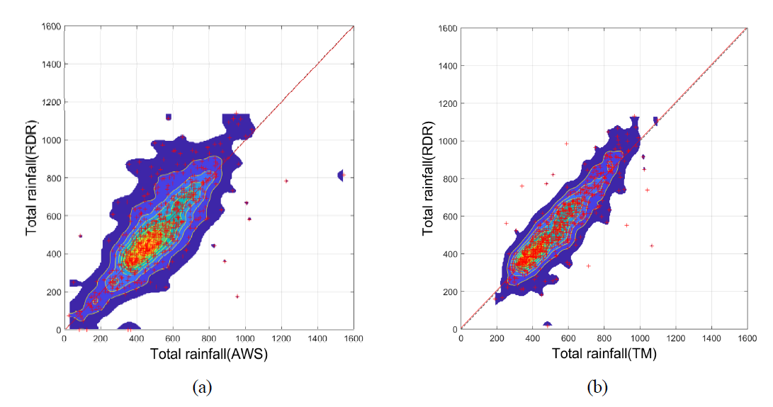 크게 나타나고 있음을 확인할 수 있다. 여기서 레이더 강수량 대비 분산 정도가 크다는 것은 AWS의 공간 재현 성능이 TM과 비교하여 낮음을 의미하고