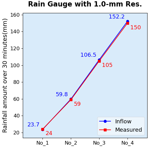 (2) 다양한 강우강도 조건에서의 강수량계 분해능별 관측 성능 실험 결과, 강우강도가 커짐에 따라 1.0 mm 전도 강수량계는 1.45 %, 0.5