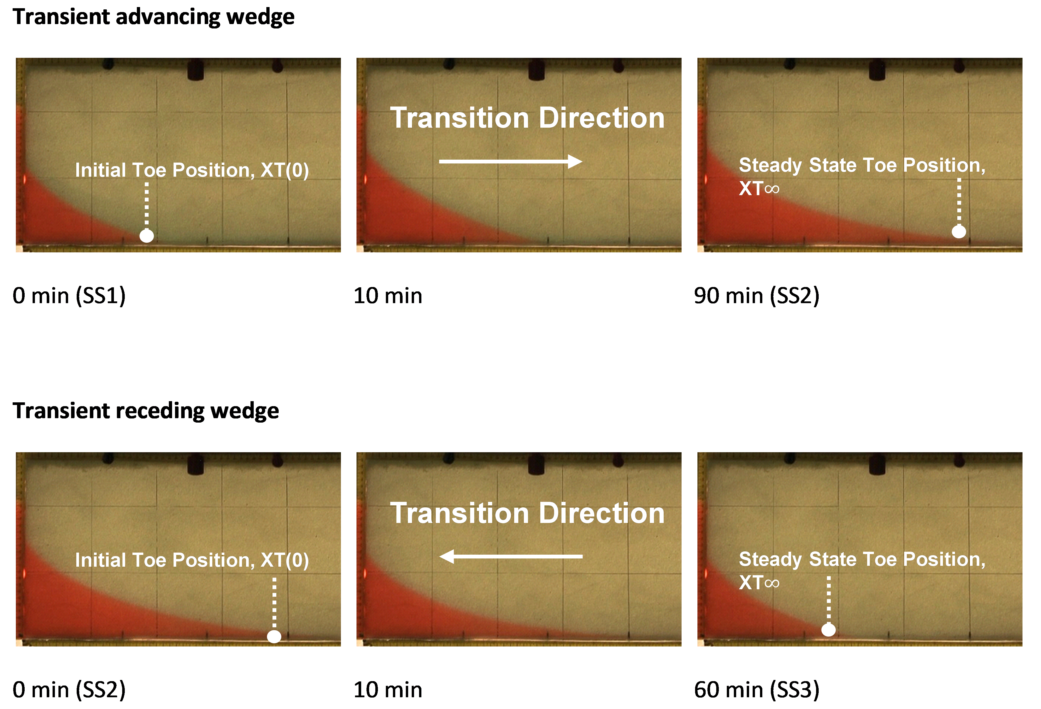 Fig. 2는 지하수 유동 경계 조건 변화에 따라 해수침투가 시간 경과에 따라 전진하거나 후퇴하며 새로운 정상 상태로 이행하는 특성을 실내 실험으로 시각화한