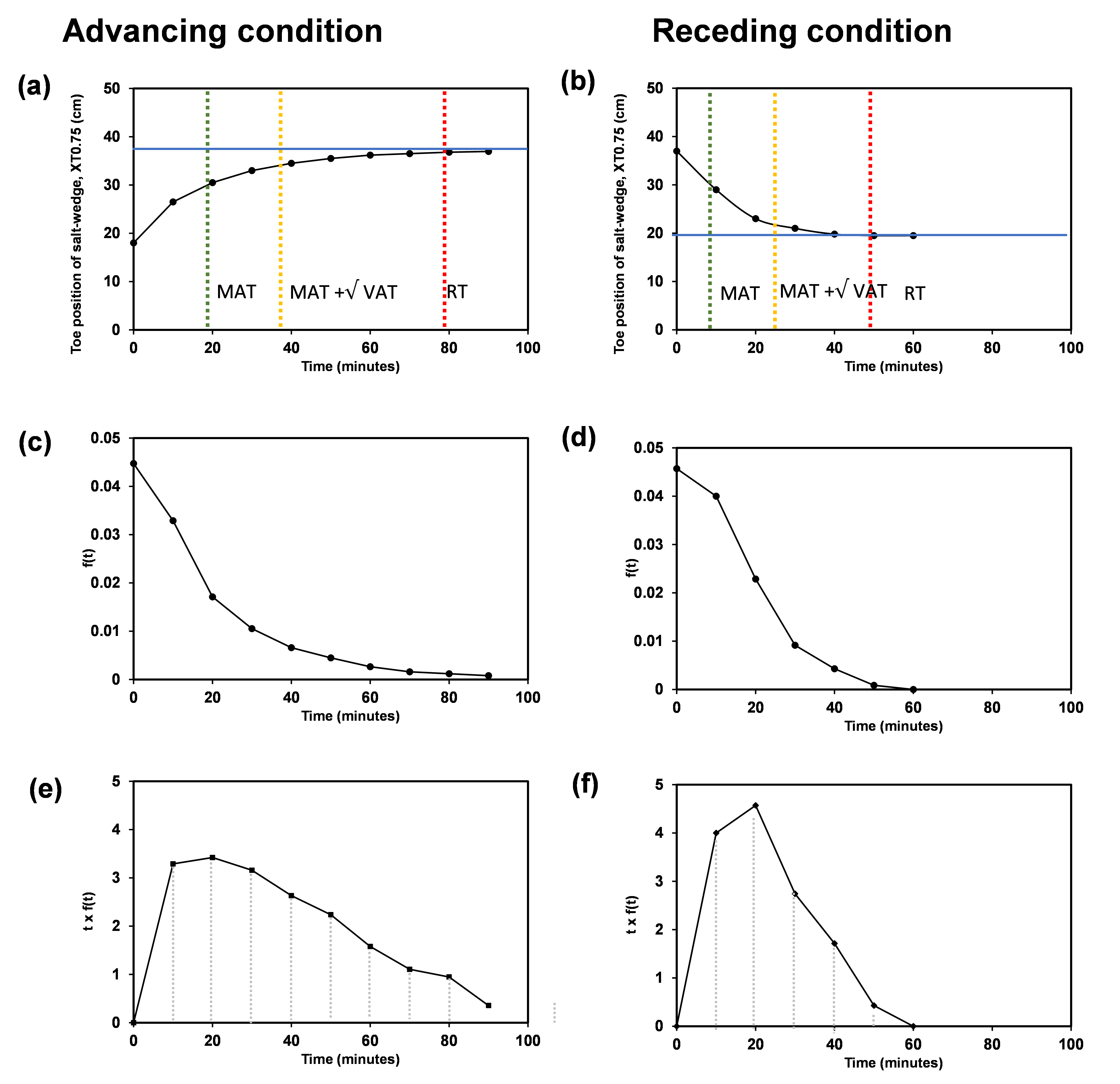 한편, Jazaei et al.(2013)은 실내 수조 실험을 통해 양 끝단에 일정 수두 경계가 유지되면, 시스템이 시간에 따라 점진적으로 수두 분포를 조정함을 실증하였다. 이때 MAT는