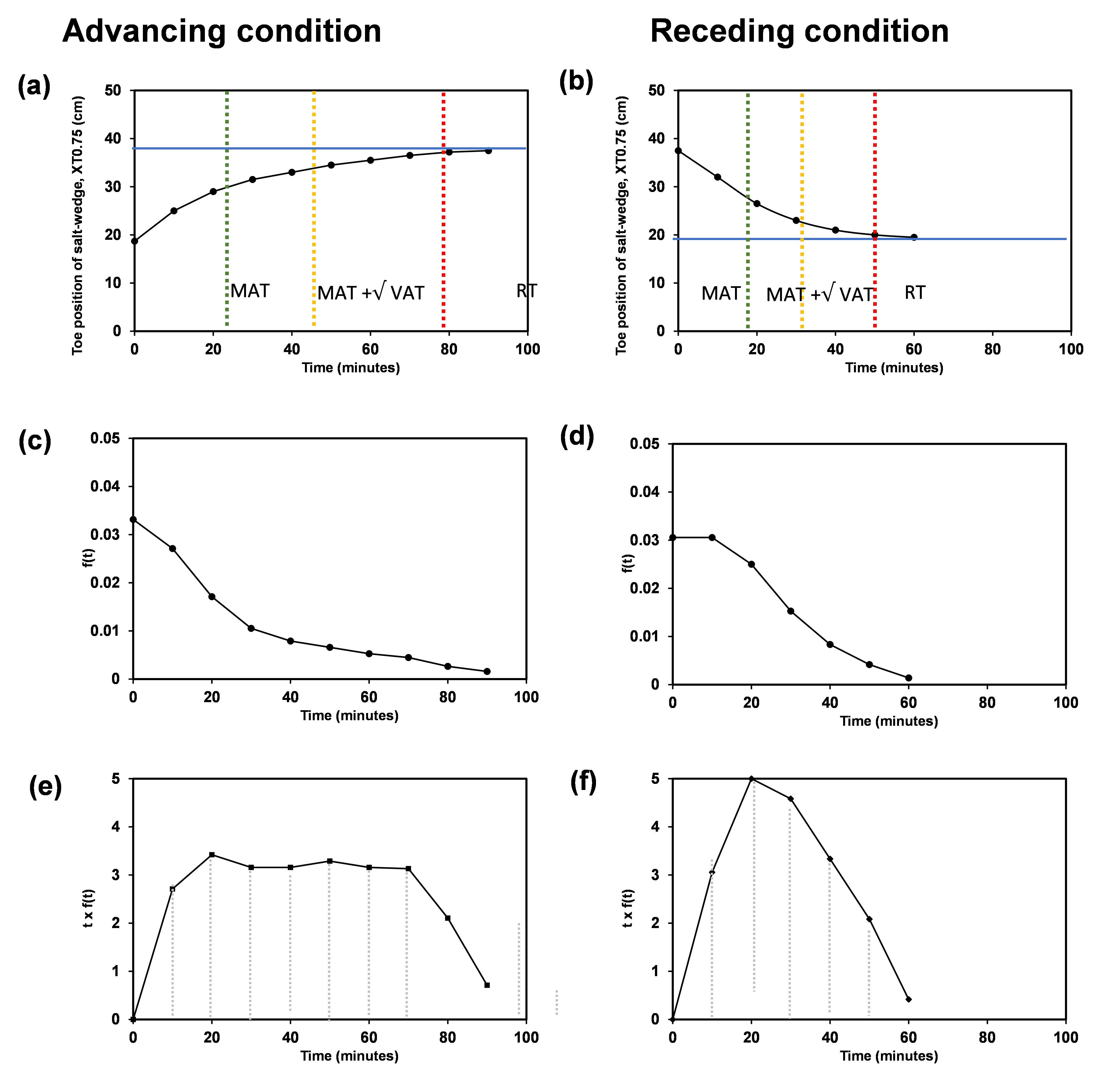 해수침투 전진 조건에서는 비교적 긴 시간에 걸쳐 전이 반응이 지속되어 MAT와 RT 차이가 크게 나타난다. 반면 후퇴 조건에서는 초기 단계의 반응이