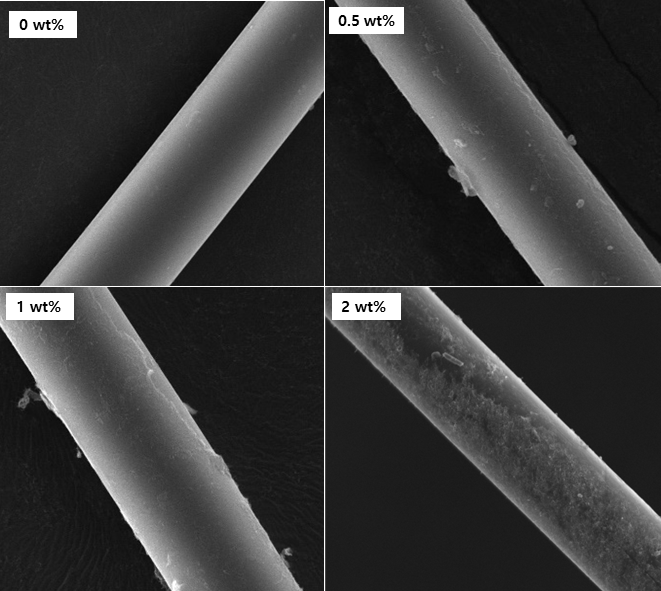 형성되는 단계로 해석된다. 이는 낮은 농도에서도 섬유와 MWCNT 사이의 상호작용이 충분히 발생한다는 점을 보여준다. 1 wt% 시편에서는 코팅층의
