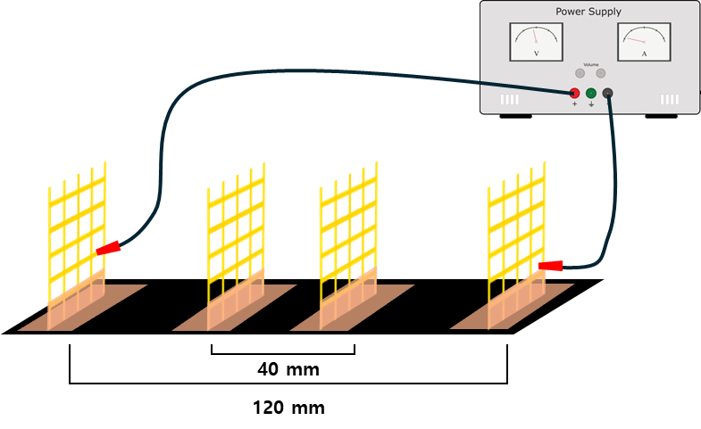 전극에 클램프를 연결하여 회로를 구성하였다. 이후 인가 전압을 10 V에서 60 V까지 단계적으로 변화시키며 전원을 공급하였다. 실험은 시편의 초기