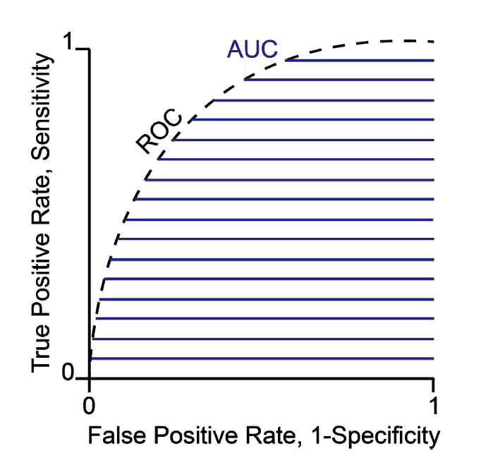 방법으로, ROC는 그래프 안에 도시되는 선으로 그래프 좌측 상단에 가까울수록 좋은 성능을 나타내며, AUC는 ROC 곡선 아래의 영역을 의미하고