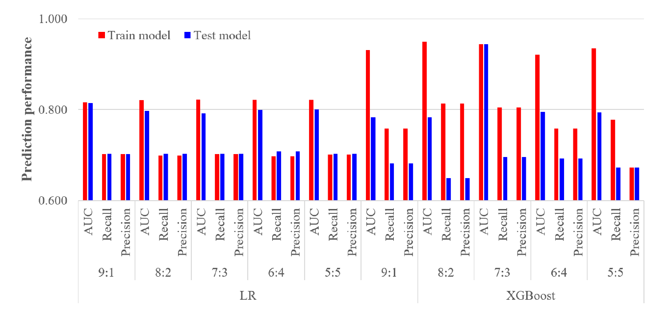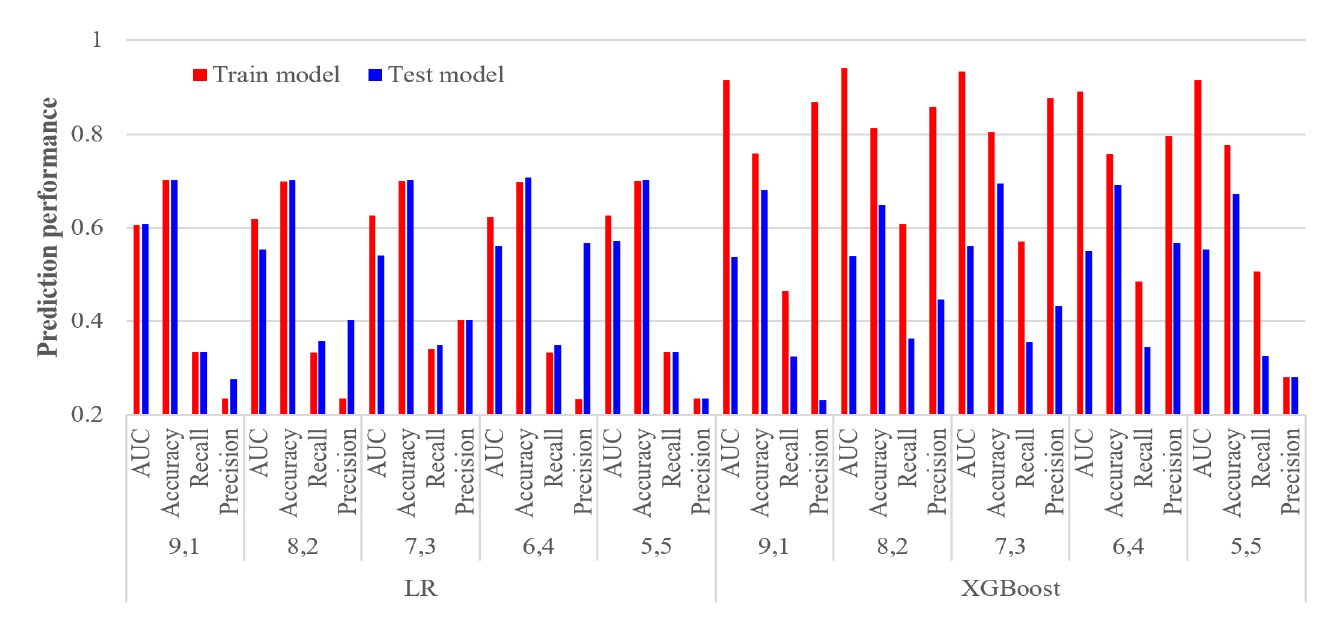 Fig. 4. The Results of Prediction Performance for LR and XG according to Ratio about