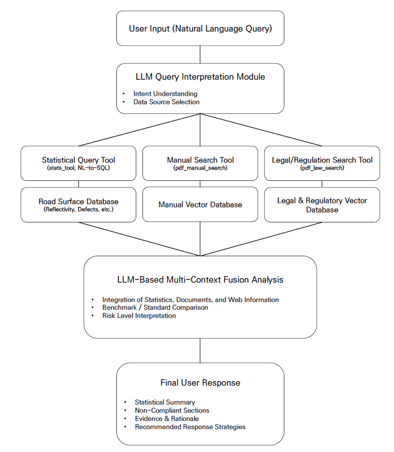 통해 도로 손상 데이터베이스, 유지관리 지침서(PDF), 플랫폼 매뉴얼(PDF), 법령 문서, 외부 웹 API를 직접 조회하여 컨텍스트로 활용할 수