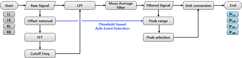 통과하면 로드셀에서 발생한 아날로그 신호가 계측되며 이 신호를 처리하여 축하중과 총중량을 산정한다. 구체적인 하중 산정 과정은 Fig. 2와 같다.