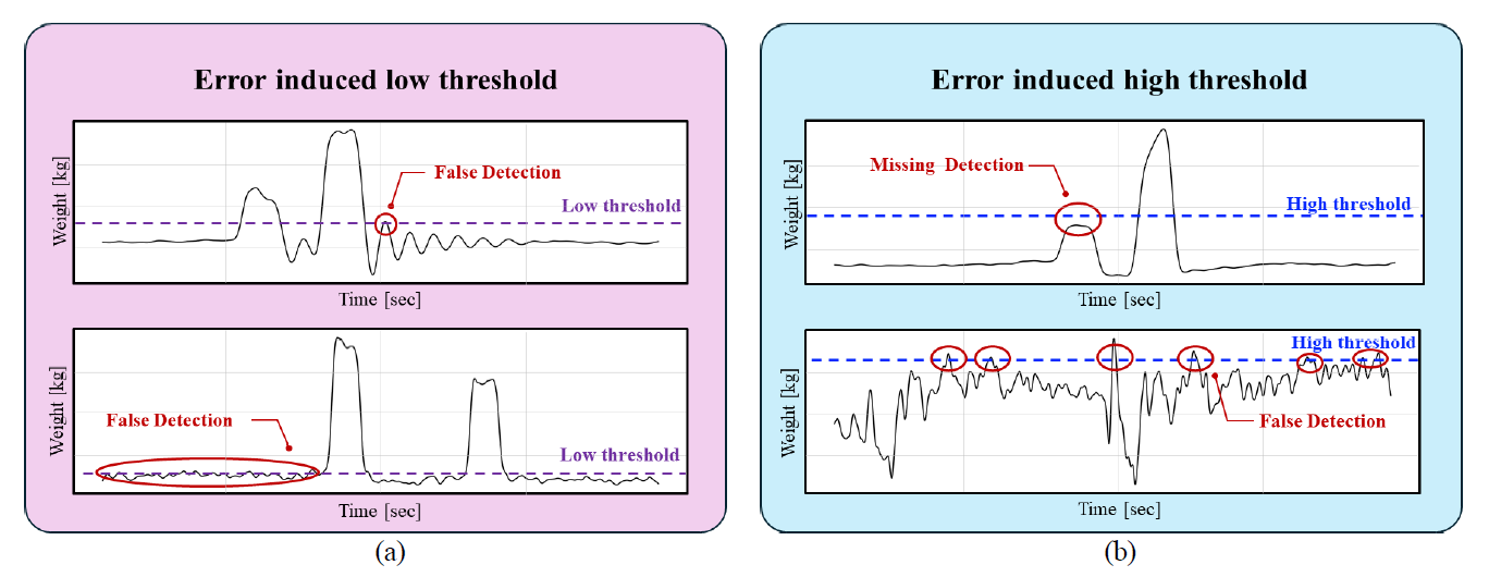 detection)을 발생하게 한다. 반대로 높은 임계값은 Fig. 3(b)과 같이 진폭이 낮은 축하중을 검출하지 못하고(missing detection), 센서 고장 등의 이상치에도 신호 일부를 하중 구간으로 잘못 분류해