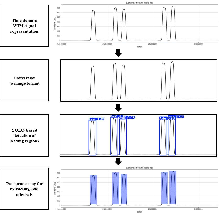 명확히 식별되는 점을 고려한 것으로, 제안된 방법은 시계열 신호를 객체 인식이 가능한 2차원 이미지로 변환하여 축 하중 구간을 단일 객체로 모델링하여